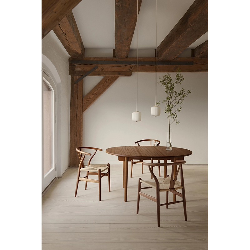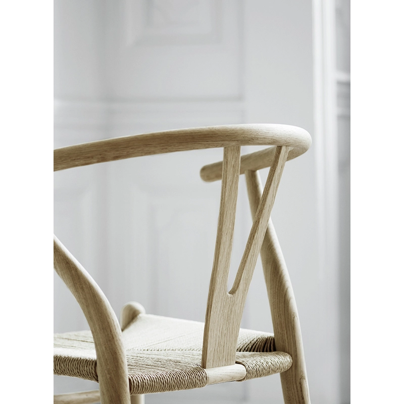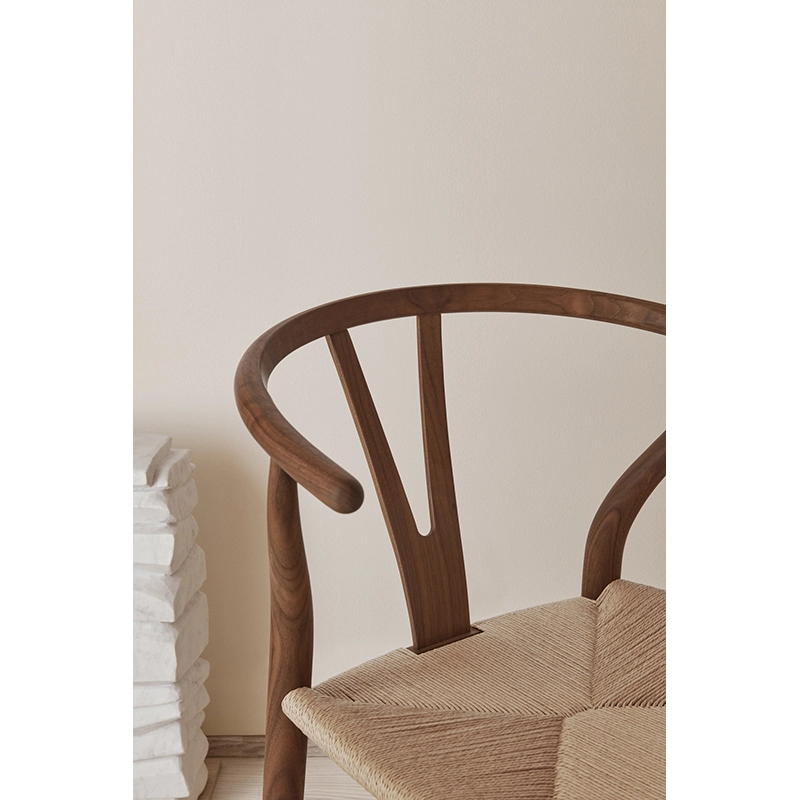 Le Wishbone Armchair CH24 est un petit fauteuil léger et sculptural qui peut être aussi bien utilisé en chaise de salle à manger qu'en fauteuil de salon pour se relaxer. La chaise CH24 est la chaise la plus célèbre et la plus vendue du designer danois Hans J.Wegner. Dessiné en 1949 par Hans J. Wegner pour Carl Hansen & Son, ce fauteuil est un chef-d'œuvre de l'artisanat. Signe de son succès, Carl Hansen produit la chaise Wishbone CH24 depuis plus d’un demi-siècle sans discontinuité. Le barreau du dossier est courbé à la vapeur apportant une liberté de mouvement et un confort optimal. Lors de sa création, Wegner choisit de fusionner le dossier et l’accoudoir en une seule pièce. Pour stabiliser la partie supérieure courbée à la vapeur et assurer un soutien confortable au dos, le designer développa le support en forme de Y, caractéristique de la chaise.  Nécessitant plus de cent étapes de production, l'assise est entièrement tissée à la main avec 120 mètres de corde de papier pour une résistance assurée pendant plus de 50 ans. Belle sous tous les angles, la chaise Wishbone CH24-Carl Hansen, appartient à la série des « fauteuils chinois », inspirés à Wegner par des portraits de commerçants danois assis sur des sièges Ming. Au fil du temps, la chaise Wishbone CH24 est devenue une figure emblématique du design danois. La fauteuil Wishbone CH24 de la maison danoise Carl Hansen, peut-être utilisé comme chaise de repas, fauteuil de bureau ou fauteuil d’appoint dans un salon.