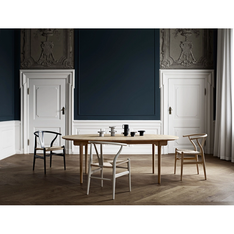 Le Wishbone Armchair CH24 est un petit fauteuil léger et sculptural qui peut être aussi bien utilisé en chaise de salle à manger qu'en fauteuil de salon pour se relaxer. La chaise CH24 est la chaise la plus célèbre et la plus vendue du designer danois Hans J.Wegner. Dessiné en 1949 par Hans J. Wegner pour Carl Hansen & Son, ce fauteuil est un chef-d'œuvre de l'artisanat. Signe de son succès, Carl Hansen produit la chaise Wishbone CH24 depuis plus d’un demi-siècle sans discontinuité. Le barreau du dossier est courbé à la vapeur apportant une liberté de mouvement et un confort optimal. Lors de sa création, Wegner choisit de fusionner le dossier et l’accoudoir en une seule pièce. Pour stabiliser la partie supérieure courbée à la vapeur et assurer un soutien confortable au dos, le designer développa le support en forme de Y, caractéristique de la chaise.  Nécessitant plus de cent étapes de production, l'assise est entièrement tissée à la main avec 120 mètres de corde de papier pour une résistance assurée pendant plus de 50 ans. Belle sous tous les angles, la chaise Wishbone CH24-Carl Hansen, appartient à la série des « fauteuils chinois », inspirés à Wegner par des portraits de commerçants danois assis sur des sièges Ming. Au fil du temps, la chaise Wishbone CH24 est devenue une figure emblématique du design danois. La fauteuil Wishbone CH24 de la maison danoise Carl Hansen, peut-être utilisé comme chaise de repas, fauteuil de bureau ou fauteuil d’appoint dans un salon.
