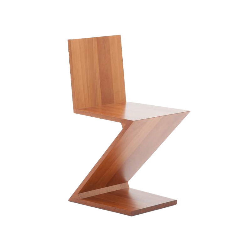 chaises en remplaçant la disposition classique des éléments - pieds, assise, dossier - par une feuille continue en bois formant un motif en "Z" inversé. L'expertise artisanale de