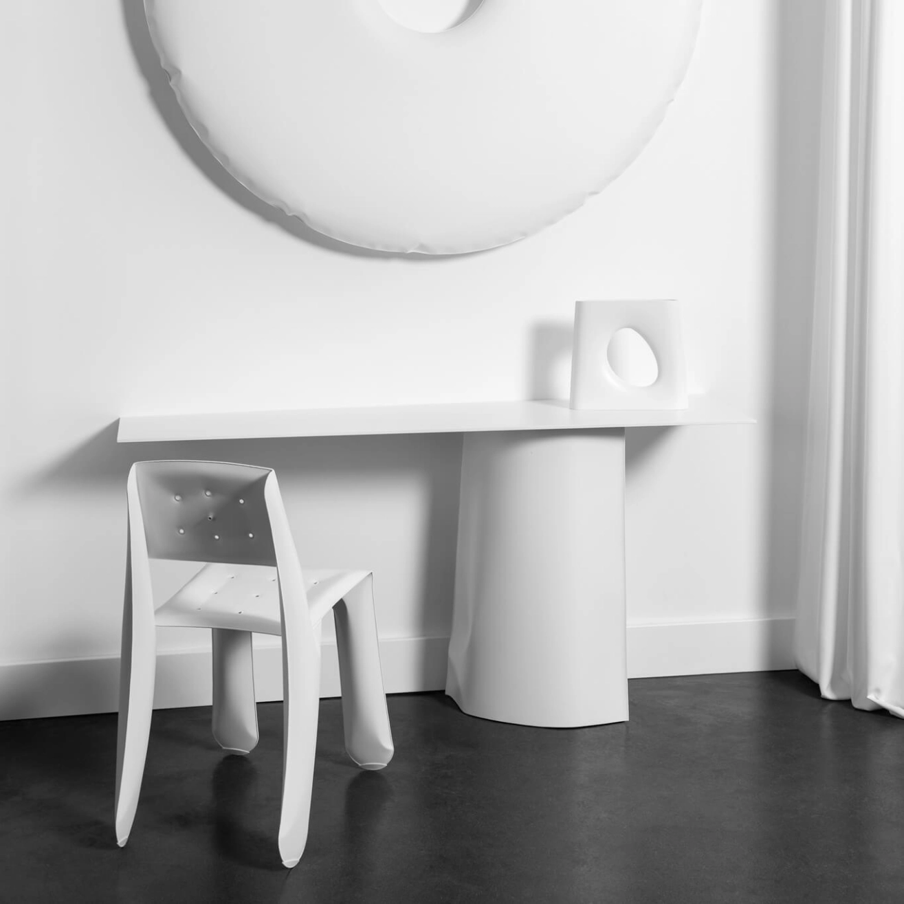 La chaise Chippensteel est une création singulière qui repense les codes du mobilier en mêlant héritage classique et approche futuriste. Conçue par le designer Oskar Zieta, cette pièce surprend par sa silhouette inspirée du style Chippendale, revisitée avec une audace technologique propre à la marque Zieta. Réalisée en acier gonflé selon la technique FiDU, un procédé d’expansion du métal par pressurisation, la chaise Chippensteel présente des volumes organiques et tendus qui lui confèrent une présence sculpturale unique. Légère, résistante et visuellement saisissante, elle transforme la matière en une véritable expérimentation artistique. La chaise Chippensteel incarne ainsi la rencontre entre tradition et innovation, faisant écho à la démarche exploratoire de Zieta, qui repousse sans cesse les limites de la fabrication contemporaine. Plus qu’un simple siège, elle se définit comme une œuvre design à part entière, captivant autant par sa technicité que par son esthétique.