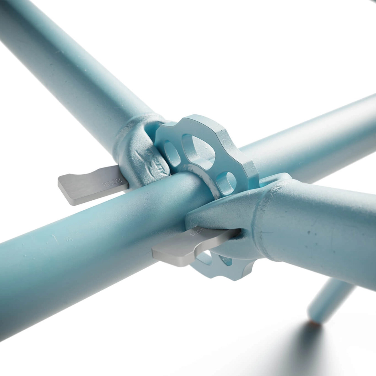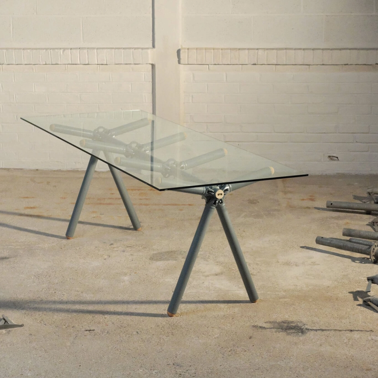 Un projet sur mesure est la seule solution pour sauver la flotte d'échafaudages d’Altrad-Plettac d’un avenir compromis… et c’est là que la table Clavex disponible en 3 tailles (pour 6,8 ou 10 personnes) entre en scène. Après des années de location, ces échafaudages sont désormais inadaptés pour supporter un travailleur en hauteur, mais ils conservent toutes leurs qualités structurelles lorsqu’ils sont utilisés au sol. C’est dans cette optique que Maximum repère une opportunité de création d’une pièce unique. Une cloison en verre est découpée pour s’ajuster parfaitement à l’espace. Ce verre est durci pour des raisons de sécurité, ce qui le rend impossible à découper à nouveau. Lorsque retirés, ces panneaux de verre, même en parfait état, finissent systématiquement au centre de recyclage. En raison de leurs dimensions fixes, leur réutilisation devient un défi. La peinture époxy utilisée est une poudre pulvérisée sur les pièces en acier avant d’être cuite à 200°C. Pendant ce processus, une partie de la poudre se répand également sur les panneaux de verre. Une fois l’application effectuée, une partie de cette poudre est aspirée dans les circuits de récupération, où elle se mélange avec les résidus dans les réservoirs. Le mélange résultant est totalement réutilisable, bien que chaque couleur obtenue soit unique et imprévisible.