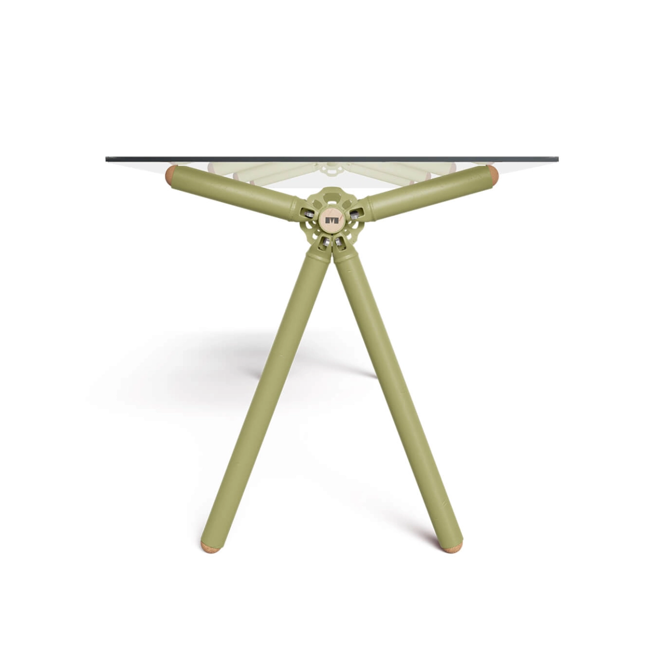 Un projet sur mesure est la seule solution pour sauver la flotte d'échafaudages d’Altrad-Plettac d’un avenir compromis… et c’est là que la table Clavex disponible en 3 tailles (pour 6,8 ou 10 personnes) entre en scène. Après des années de location, ces échafaudages sont désormais inadaptés pour supporter un travailleur en hauteur, mais ils conservent toutes leurs qualités structurelles lorsqu’ils sont utilisés au sol. C’est dans cette optique que Maximum repère une opportunité de création d’une pièce unique. Une cloison en verre est découpée pour s’ajuster parfaitement à l’espace. Ce verre est durci pour des raisons de sécurité, ce qui le rend impossible à découper à nouveau. Lorsque retirés, ces panneaux de verre, même en parfait état, finissent systématiquement au centre de recyclage. En raison de leurs dimensions fixes, leur réutilisation devient un défi. La peinture époxy utilisée est une poudre pulvérisée sur les pièces en acier avant d’être cuite à 200°C. Pendant ce processus, une partie de la poudre se répand également sur les panneaux de verre. Une fois l’application effectuée, une partie de cette poudre est aspirée dans les circuits de récupération, où elle se mélange avec les résidus dans les réservoirs. Le mélange résultant est totalement réutilisable, bien que chaque couleur obtenue soit unique et imprévisible.