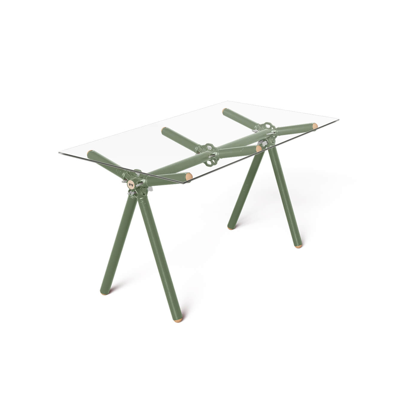 Un projet sur mesure est la seule solution pour sauver la flotte d'échafaudages d’Altrad-Plettac d’un avenir compromis… et c’est là que la table Clavex disponible en 3 tailles (pour 6,8 ou 10 personnes) entre en scène. Après des années de location, ces échafaudages sont désormais inadaptés pour supporter un travailleur en hauteur, mais ils conservent toutes leurs qualités structurelles lorsqu’ils sont utilisés au sol. C’est dans cette optique que Maximum repère une opportunité de création d’une pièce unique. Une cloison en verre est découpée pour s’ajuster parfaitement à l’espace. Ce verre est durci pour des raisons de sécurité, ce qui le rend impossible à découper à nouveau. Lorsque retirés, ces panneaux de verre, même en parfait état, finissent systématiquement au centre de recyclage. En raison de leurs dimensions fixes, leur réutilisation devient un défi. La peinture époxy utilisée est une poudre pulvérisée sur les pièces en acier avant d’être cuite à 200°C. Pendant ce processus, une partie de la poudre se répand également sur les panneaux de verre. Une fois l’application effectuée, une partie de cette poudre est aspirée dans les circuits de récupération, où elle se mélange avec les résidus dans les réservoirs. Le mélange résultant est totalement réutilisable, bien que chaque couleur obtenue soit unique et imprévisible.