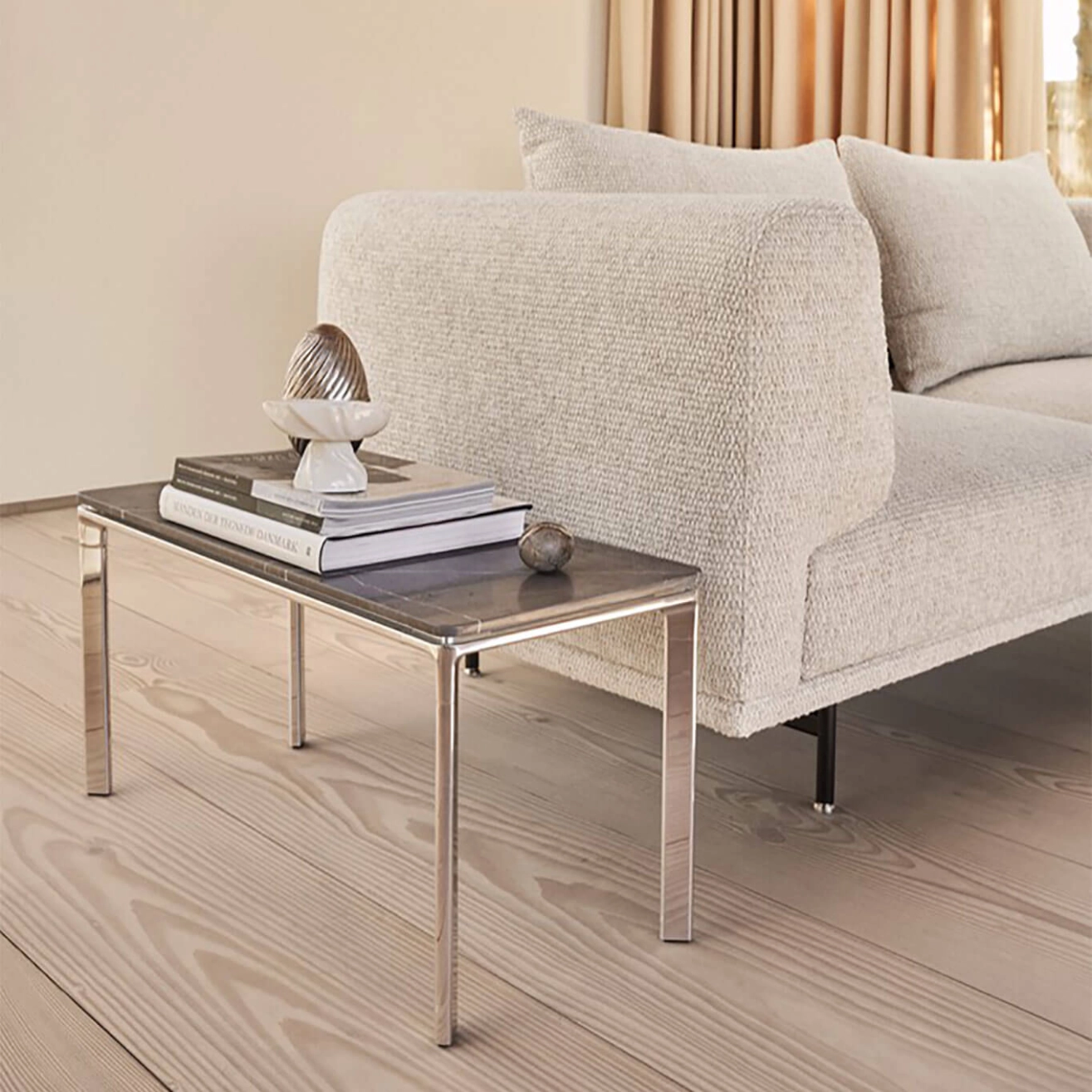 Les tables basses Vipp 426-427, conçues et éditées par Vipp, associent avec élégance la pureté du métal à la richesse de la pierre naturelle. Leur structure à quatre pieds en aluminium poli apporte légèreté visuelle et stabilité, tandis que le plateau en marbre semble flotter au-dessus du piètement. Disponibles en deux dimensions, elles se déclinent en marbre Jura Grau Blau aux nuances allant du doré chaud au gris froid, ou en Pietra Grey, marqué par des veinures contrastées noires et blanches qui créent un effet graphique raffiné. À utiliser seules ou en composition, elles offrent une solution élégante et modulable pour les espaces contemporains.