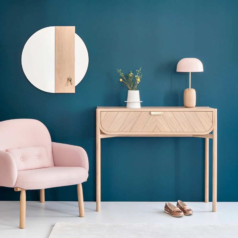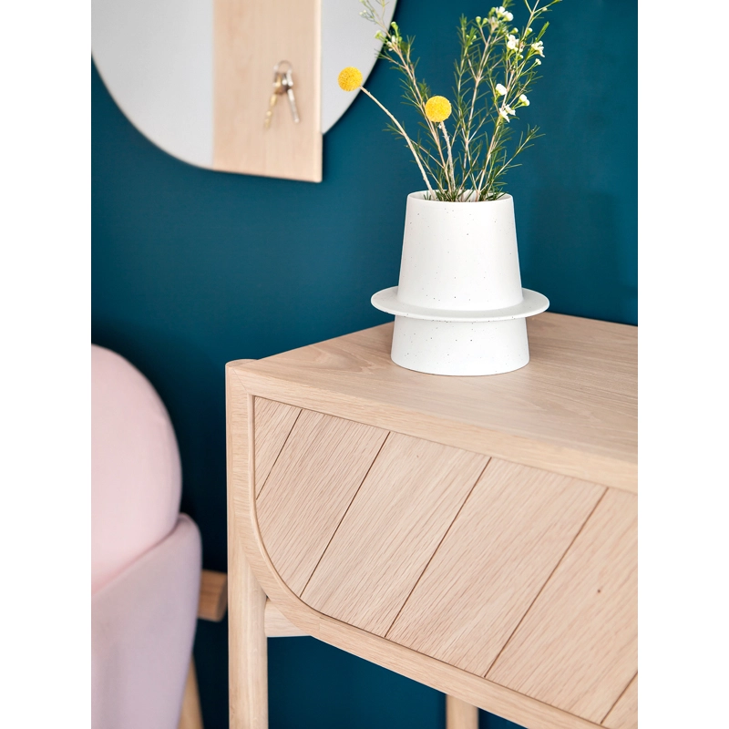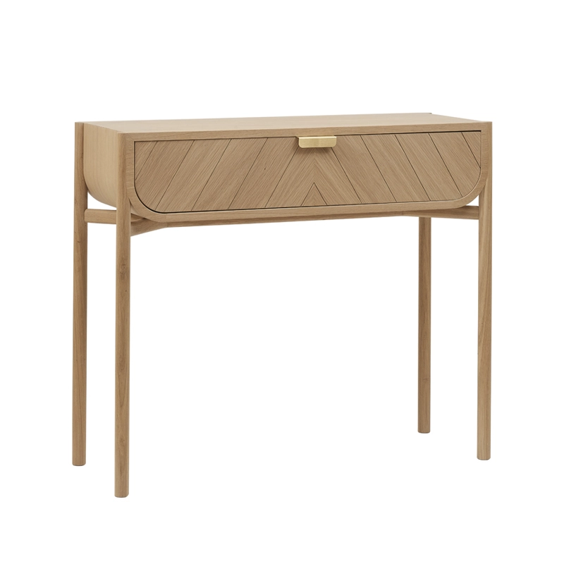 Inspirée de l’univers maritime, la console Marius deHartoaffiche une finition chêne naturel chaleureuse et authentique, associée à un tiroir disponible en chêne naturel, gris clair ou bleu pétrole La forme générale de Marius évoque la coque d’un bateau tandis que les rainures obliques qui habillent élégamment sa façade dessinent ses voiles. Elle est ornée de jolies poignées en métal doré. Elégante et épurée, la console Mariusen chêne a tout pour plaire !