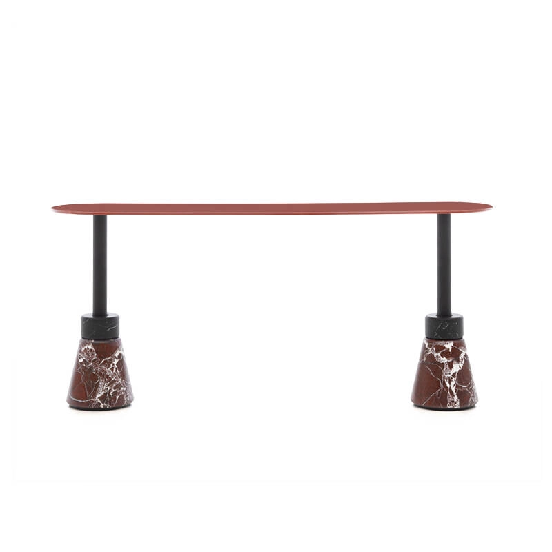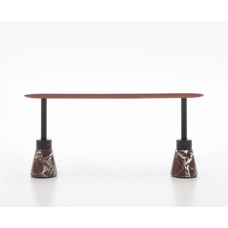 La collection Menhir renvoie sans aucun doute au classicisme grec et aux célèbres monolithes français et britanniques en érigeant une colonne matte – en marbre dans la version d’origine, qui relie l’imposante base en marbre, dite « Rocchio », à son élégant plateau en bois laqué ; ce choix de matériaux provoque un contraste assez saisissant de couleurs et d’éléments, mais aussi un certain effet de stabilité.