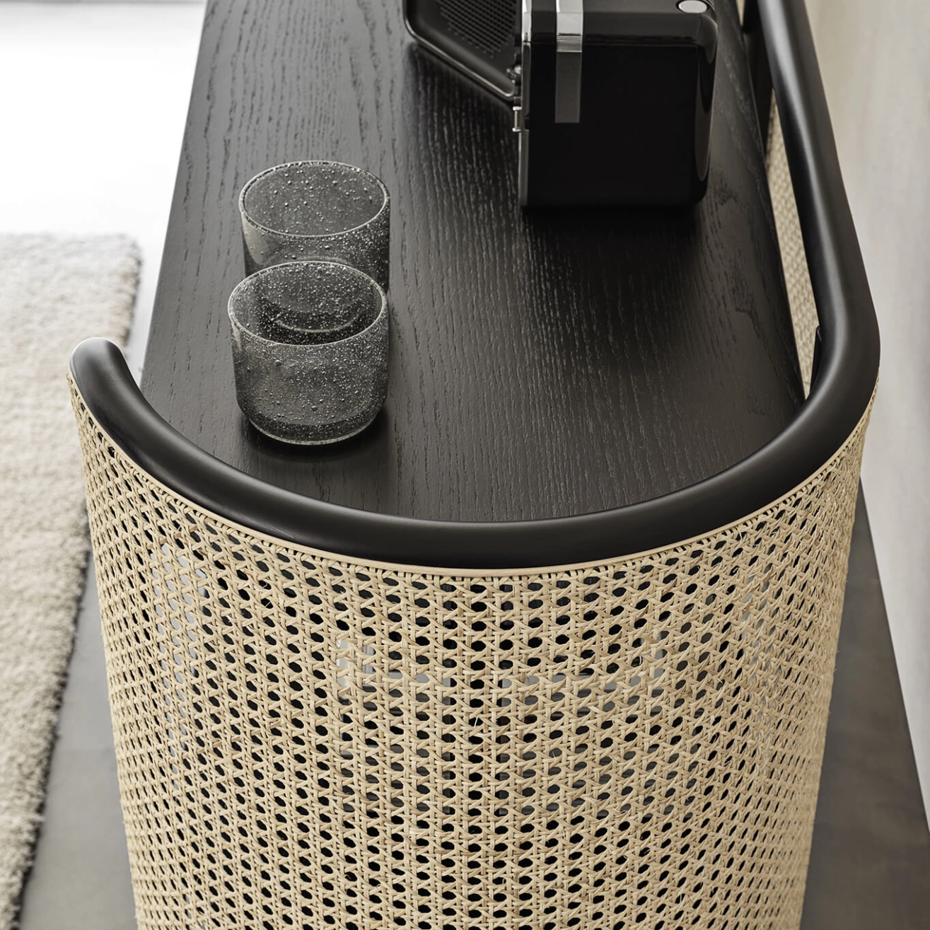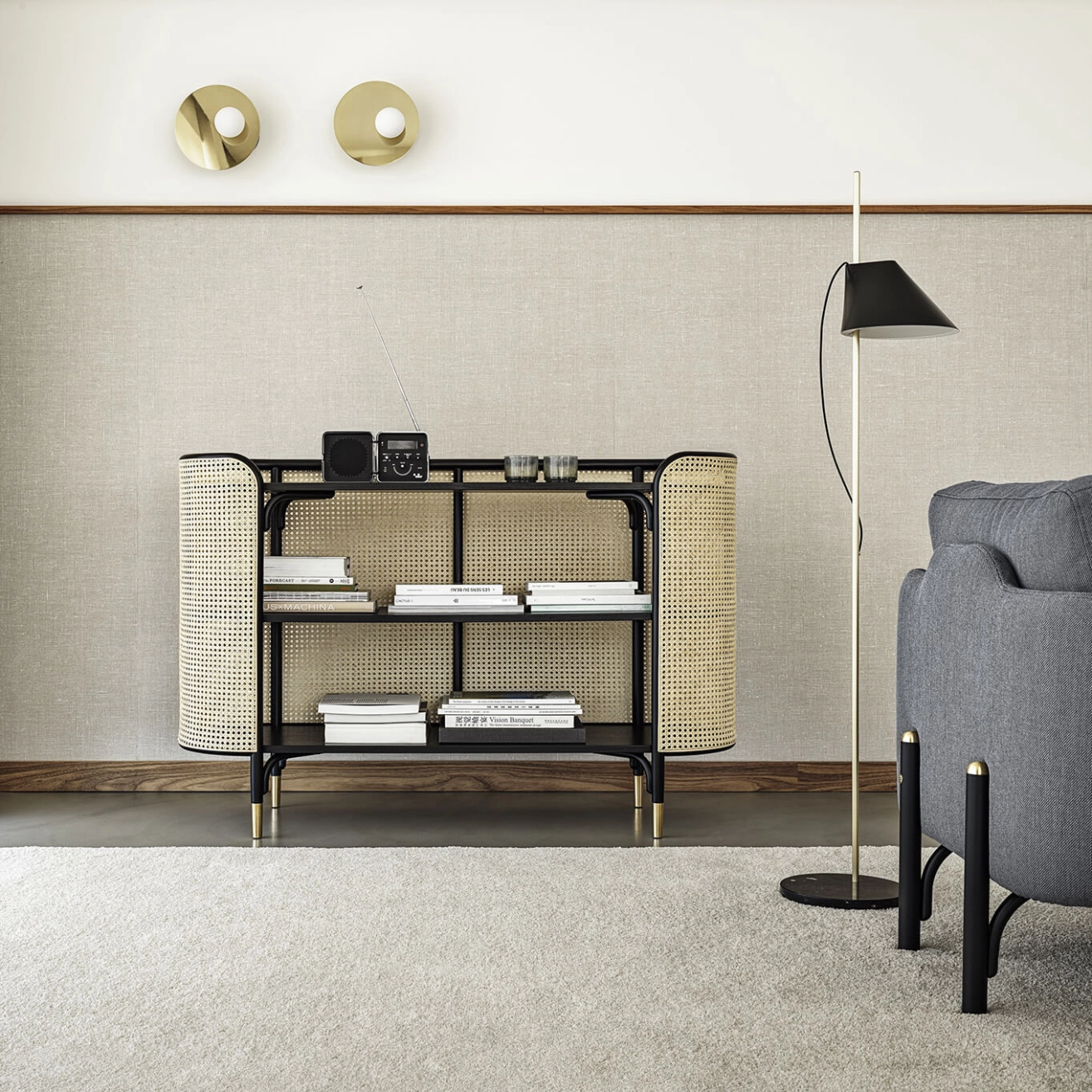 Dessinée par GamFratesi pour Gebrüder Thonet Vienna, Mos est une collection de meubles de rangement qui se distingue par des formes elliptiques et des associations de matériaux élégants. Les rangements Mos GTV s'intègrent dans tous les types d’espaces grâce à leur expression raffinée, que ce soit dans le salon, la chambre ou l’entrée. Visuellement léger, le rangement Mos est doté d’une coque en rotin tressé et de plateau en bois laqué. Le cadre en hêtre courbé teinté laqué est soutenu par des pieds en laiton.