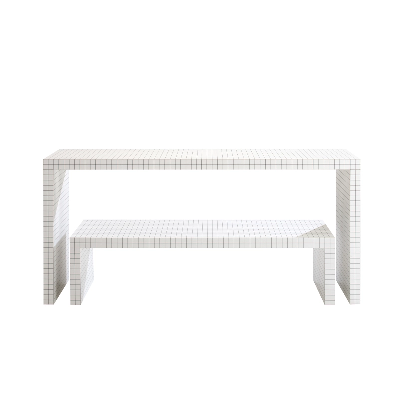Les produits de la collection Quaderna sont le résultat d’un processus hautement industrialisé et en même temps d’un grand savoir-faire artisanal. Le stratifié à carreau a été créé spécialement sur la base du design de Superstudio et présente un quadrillage avec un entraxe de 3 cm, réalisé par impression numérique. Ce stratifié est ensuite appliqué manuellement, nécessitant une grande précision et plusieurs heures de travail pour chaque pièce. La convergence des lignes du motif détermine l’homogénéité des surfaces et confère au meuble une forte personnalité.