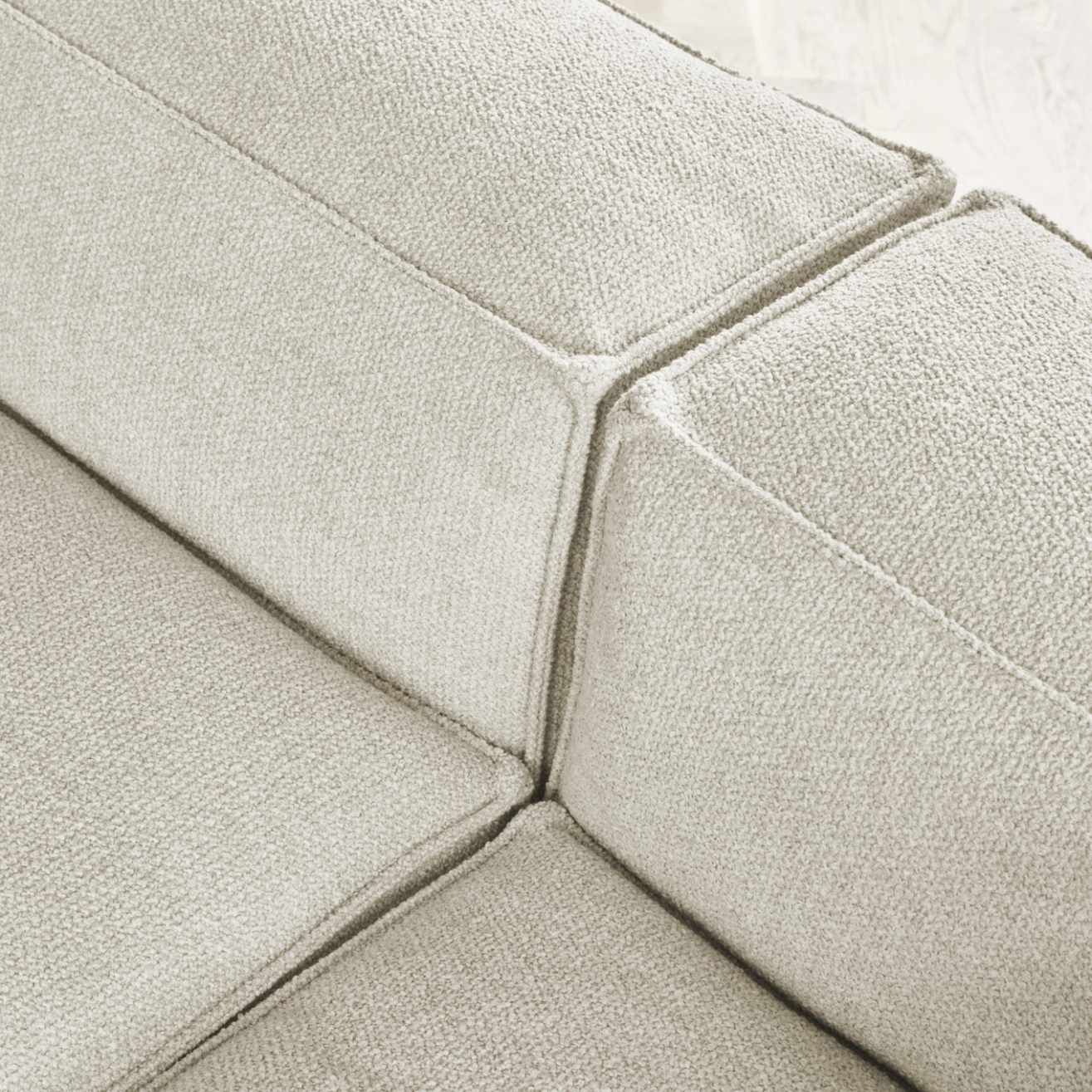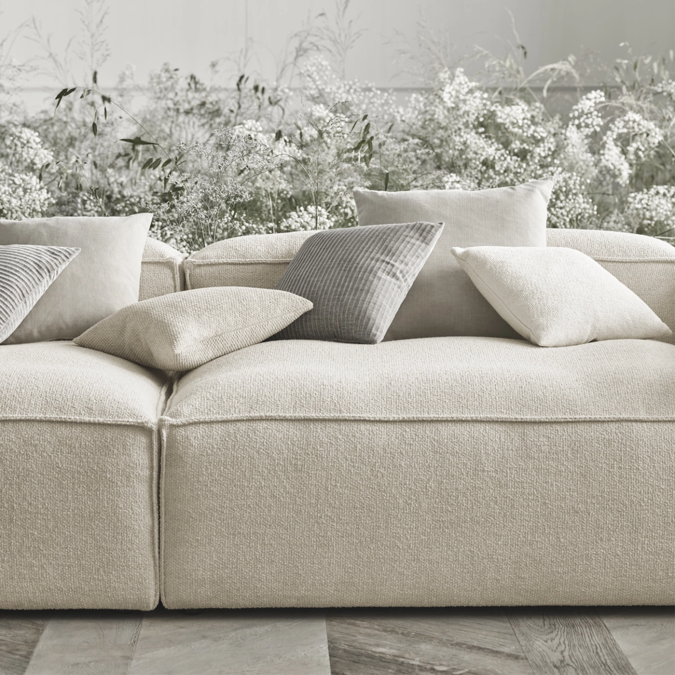 Tissu bouclé monza, bois certifié FSC™, rembourrage plumes, de duvets et de fibres, mousse froide