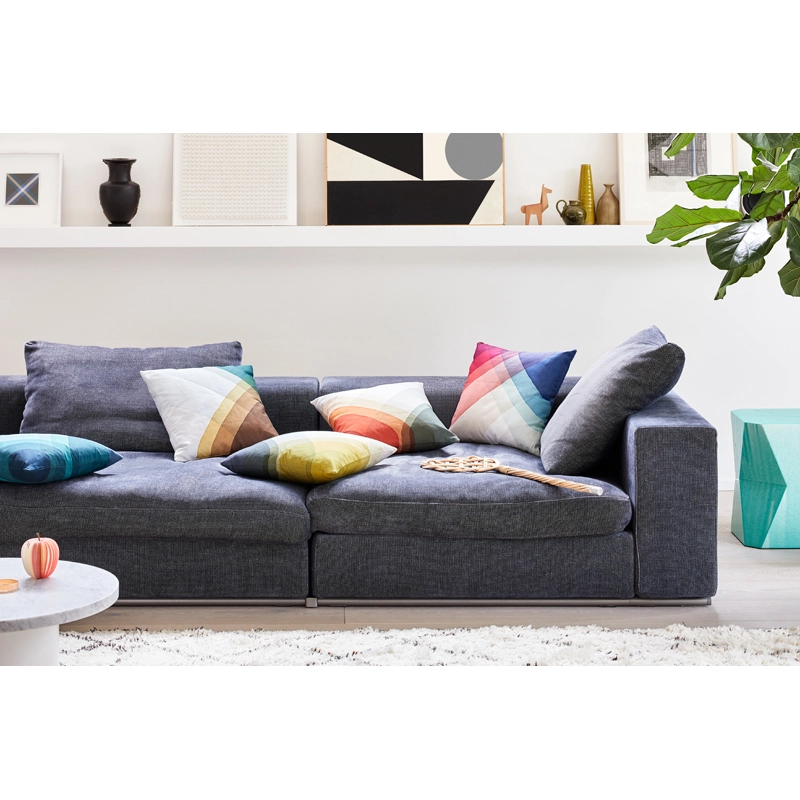 Créée par Raw-Edges pour l'ameublement et l'agencement d'un étage entier de la VitraHaus sur le Vitra Campus, la collection Herringbone est née de l‘intérêt du studio pour la technique de la teinture par immersion. Les coussins Herringbone dégagent une atmosphère de gaieté grâce à l‘utilisation de couleurs claires et de motifs captivants, qui se caractérisent par un aspect très géométrique bien qu’ils soient réalisés artisanalement. Les bandes croisées et chevauchantes d‘intensité de couleur variable ont été obtenues par de multiples immersions dans des colorants de différentes couleurs, le résultat final étant le modèle exact du motif imprimé des coussins Herringbone. Edités par Vitra, ces coussins apporte une touche vitaminée dans tous les intérieurs.