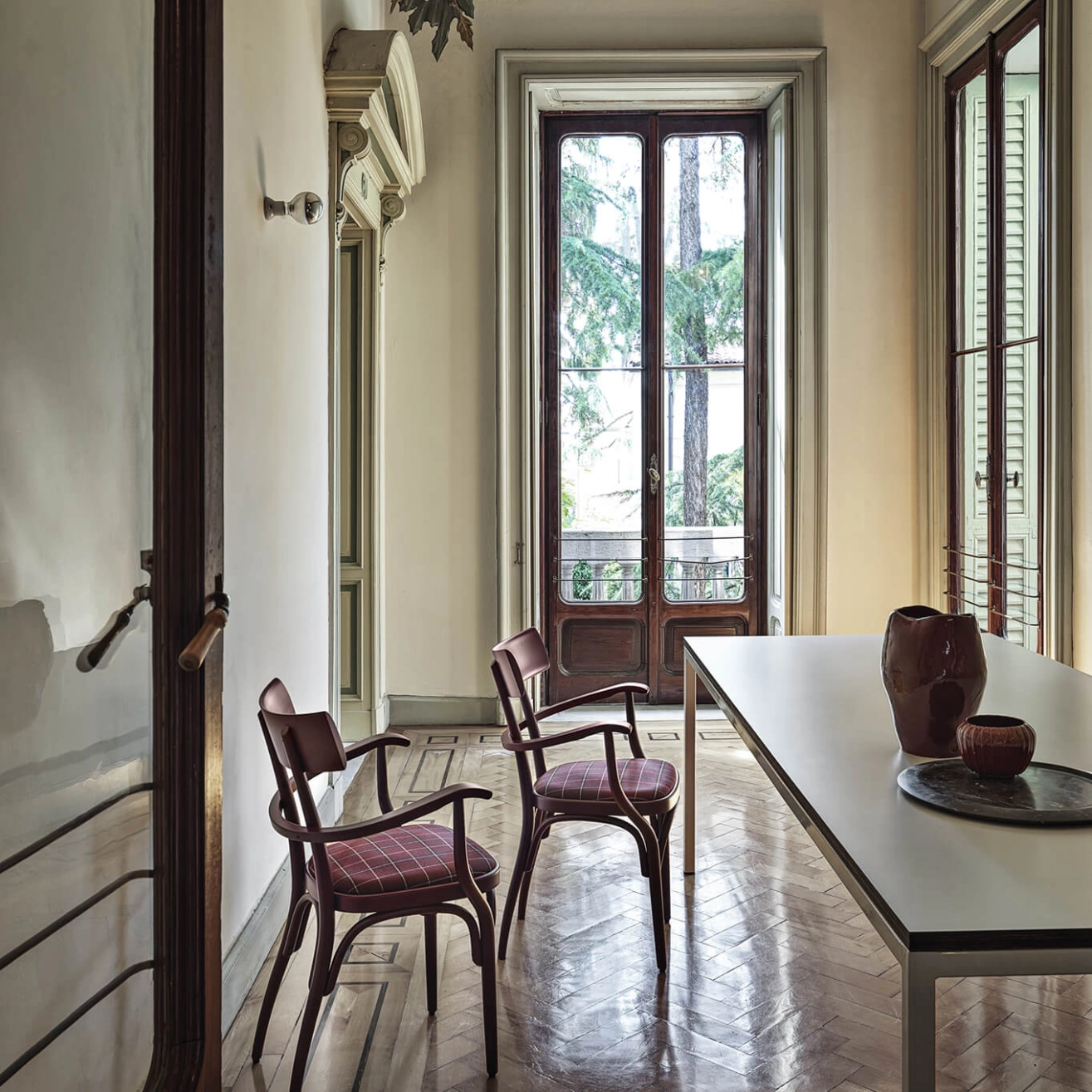 Gebrüder Thonet Vienna nait d’une famille de producteurs de meubles à succès pendant l’ère industrielle. Michael Thonet, fondateur, travaille le bois et passe de la technique du bois lamellé collé à celle du bois de section ronde courbé à la vapeur. Élégance formelle, solidité et légèreté ont déterminé le succès de Gebrüder Thonet Vienna, qui en quelques années a ouvert des sites de production dans le monde entier. Un processus de production unique qui est enraciné dans une histoire riche d’influences