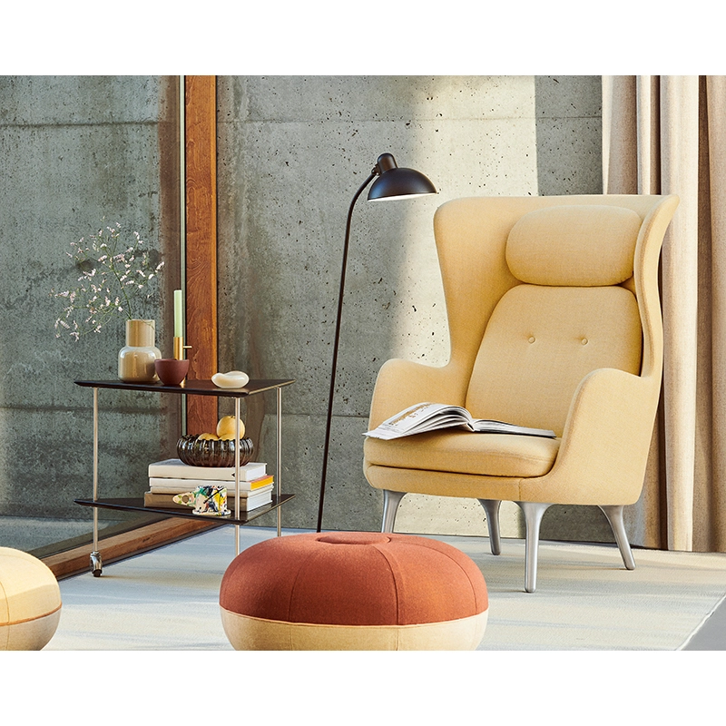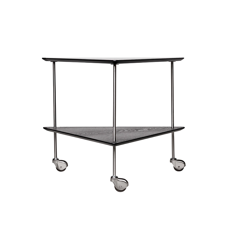 Dessinée par Arne Jacobsen et éditée pour la première fois par Fritz Hansen, AJ Trolley est une pièce originale qui allie fonction et élégance. Redécouverte parmi les archives de Fritz Hansen plus de cinquante ans après sa création, cette pièce est dotée d’un design qui s’accorde parfaitement avec les goûts et les styles de notre époque. Le légendaire designer danois Arne Jacobsen a conçu cette élégante table roulante pour prendre son thé, mais elle n'a jamais été produite pour le grand public. Ses possibilités sont cependant infinies. Architecturale et sophistiquée, elle peut servir de chariot de bar, ou de service, mais aussi de table d'appoint polyvalente. La combinaison de l'acier et du frêne noir confère à la table roulante un design décontracté, minimal et explicitement danois. Le dessin des roulettes a été soigneusement recréé pour plus d'authenticité. Les pièces de construction du système de roulement ont été modifiées par Fritz Hansen pour renforcer la structure et testées selon des normes très élevées. Ce roulement mécanique résistant à toute épreuve, dont les coloris ont été imaginés sur mesure, assure un mouvement tout en douceur.