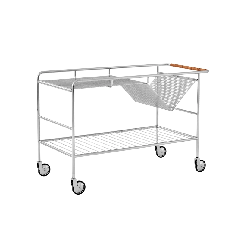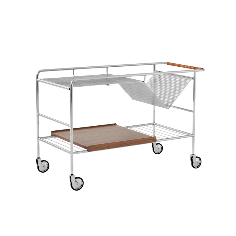 acier chrome ou noir, plateau chêne ou noyer, poignée cuir