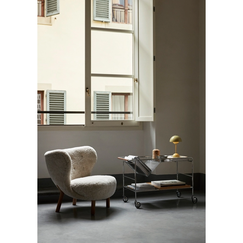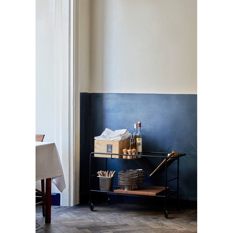 Editée par And Tradition, Alima est une desserte légère, élégante et fonctionnelle. Inspiré par le « chaos créatif » du travail à la maison, Note Design Studio a décidé de créer un rangement qui accueillerait facilement leur collection de livres, magazines, dessins et objets. Le résultat est une desserte élégante avec un emplacement en forme de V, qui permet de ranger ou d’exposer facilement les livres. Ainsi son nom reflète parfaitement sa fonction savante : Alima est un nom arabe qui signifie « érudit » ou « sage ». Idéale du salon à la cuisine, d’un espace de travail à un restaurant, Alima est dotée d’une structure métallique robuste en finition chromée ou noire matte, qui contraste avec la poignée en cuir et le plateau amovible, disponible en chêne ou noyer. Ses roulettes assurent une manœuvre facile, permettant à cette desserte d’être utilisée de différentes manières dans un intérieur, que ce soit en table d’appoint ou en rangement sous un bureau.