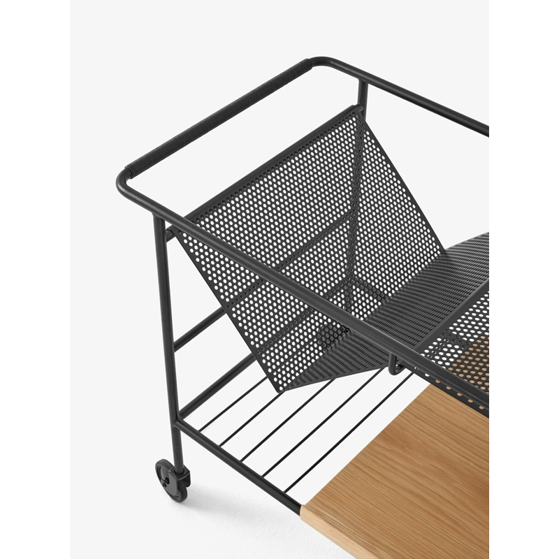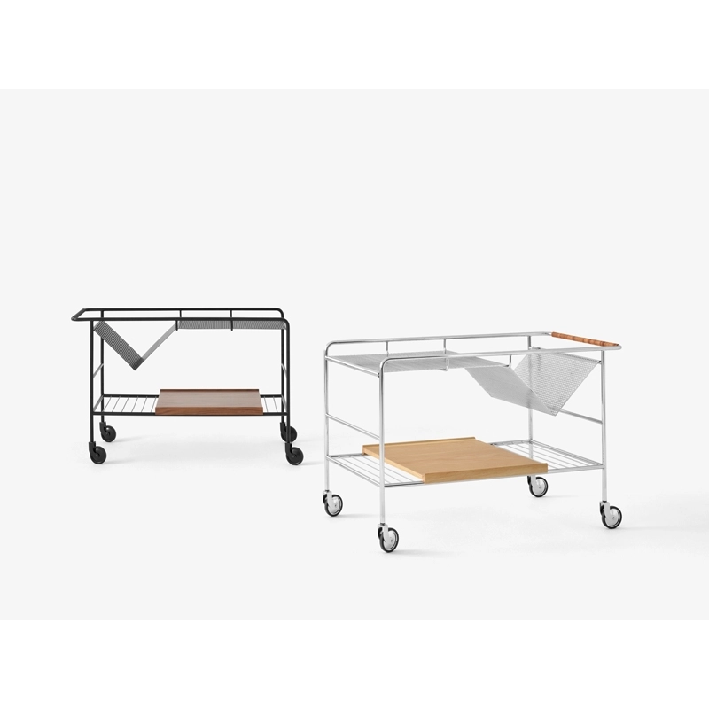 Editée par And Tradition, Alima est une desserte légère, élégante et fonctionnelle. Inspiré par le « chaos créatif » du travail à la maison, Note Design Studio a décidé de créer un rangement qui accueillerait facilement leur collection de livres, magazines, dessins et objets. Le résultat est une desserte élégante avec un emplacement en forme de V, qui permet de ranger ou d’exposer facilement les livres. Ainsi son nom reflète parfaitement sa fonction savante : Alima est un nom arabe qui signifie « érudit » ou « sage ». Idéale du salon à la cuisine, d’un espace de travail à un restaurant, Alima est dotée d’une structure métallique robuste en finition chromée ou noire matte, qui contraste avec la poignée en cuir et le plateau amovible, disponible en chêne ou noyer. Ses roulettes assurent une manœuvre facile, permettant à cette desserte d’être utilisée de différentes manières dans un intérieur, que ce soit en table d’appoint ou en rangement sous un bureau.