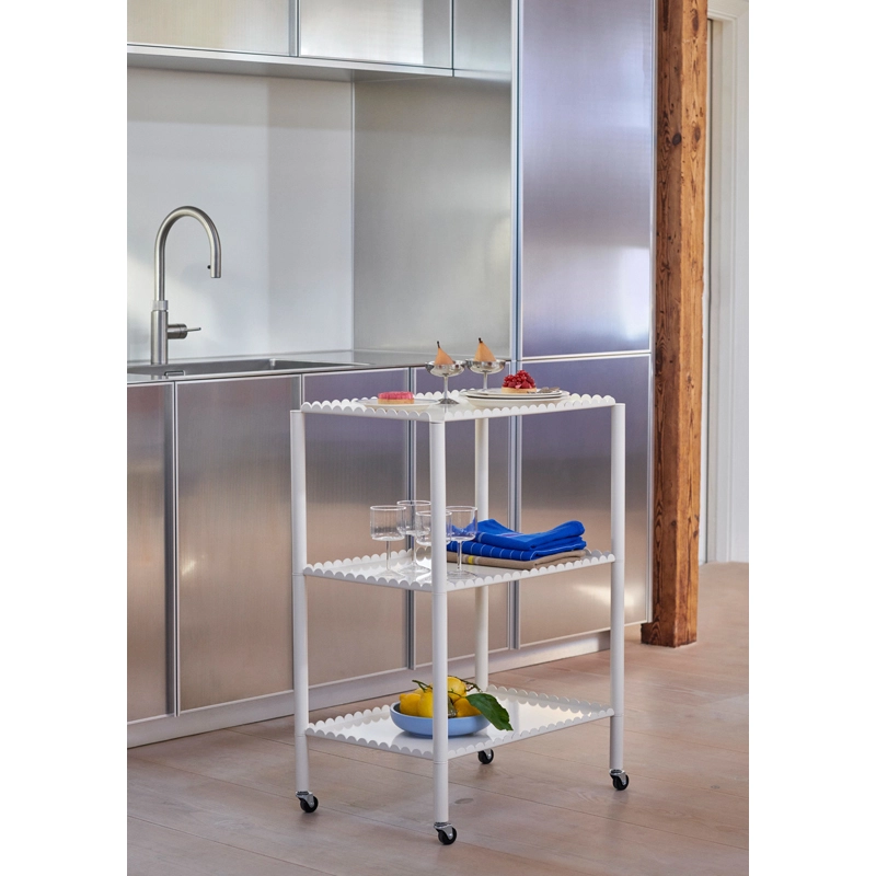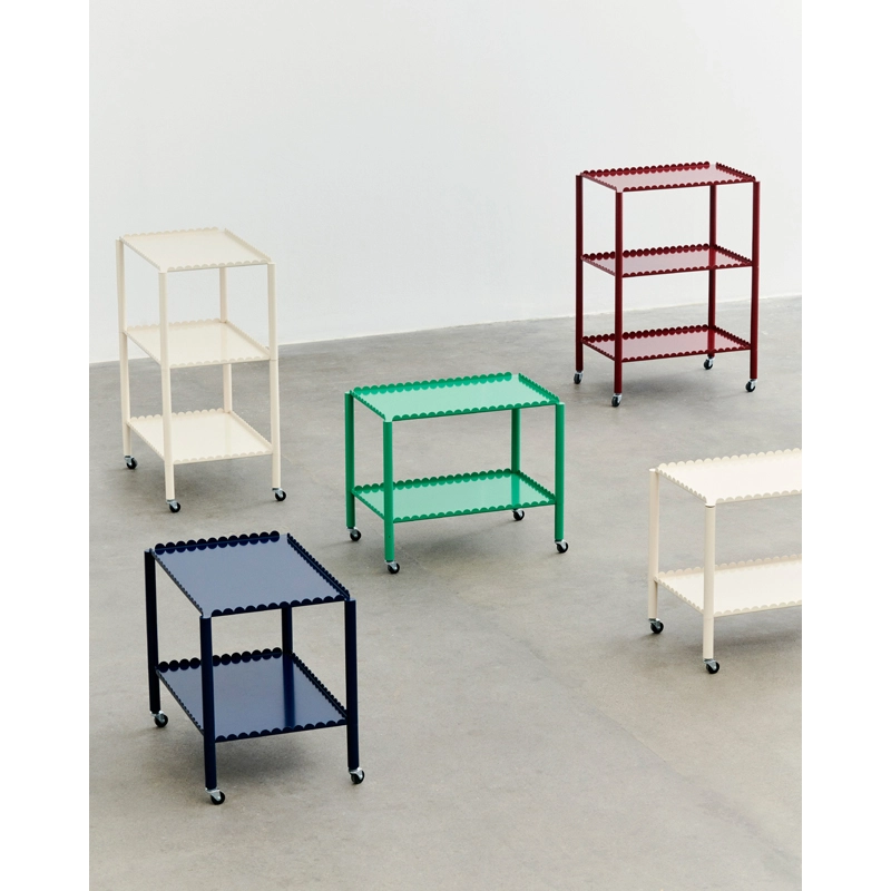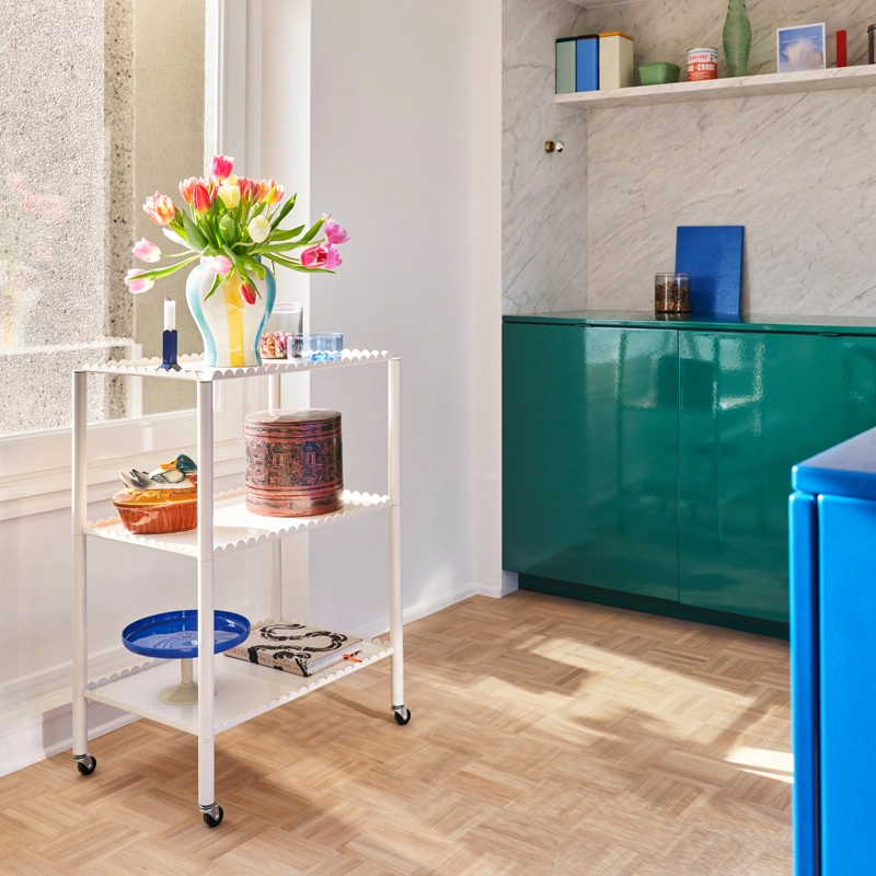 Dessinée par le duo belge Muller Van Severen pour Hay, la desserte Arcs est une pièce fonctionnelle et décorative qui se distingue par une chaine d’arcs verticaux. Petit meuble doté d’une présence forte, Arcs combine des techniques industrielles avec des lignes poétiques pour créer une expression unique et sculpturale. La structure élégante et festonnée soutient deux ou trois plateaux, avec des pieds fins montés sur roulette pour une manœuvre facile. Réalisée en acier thermolaqué dans plusieurs couleurs, la desserte Arcs s’intègre dans différentes pièces de la maison : dans le salon pour exposer ou ranger des objets, dans la cuisine pour créer un rangement supplémentaire, ou encore dans la chambre comme table de chevet.