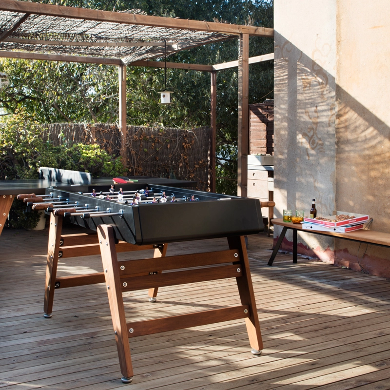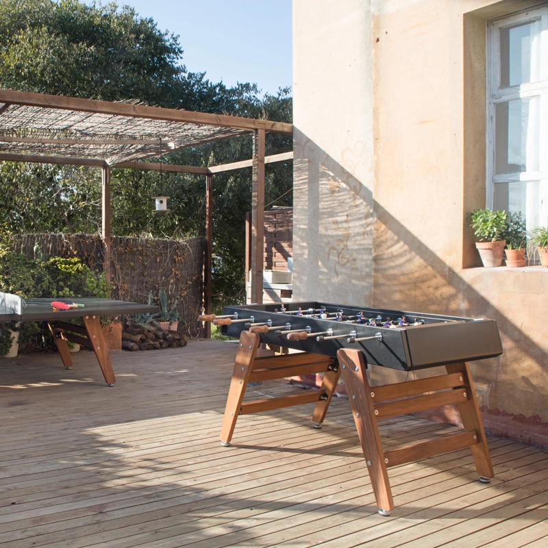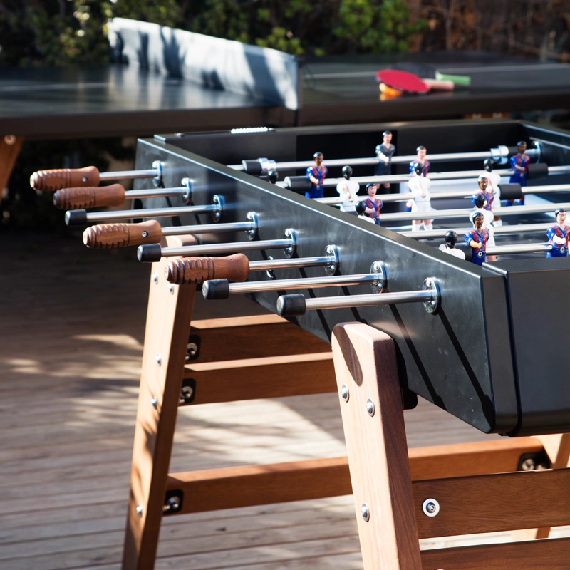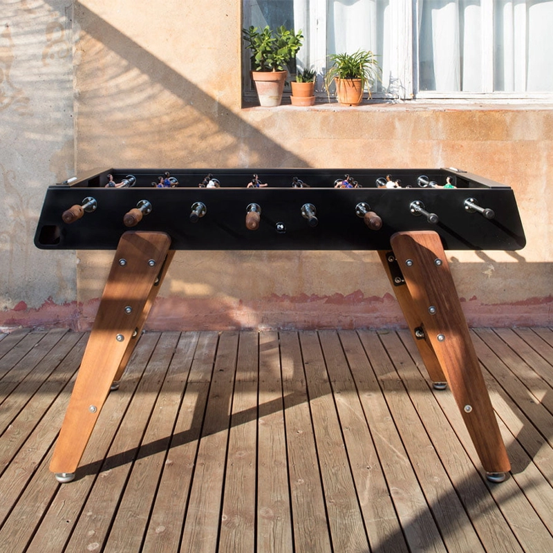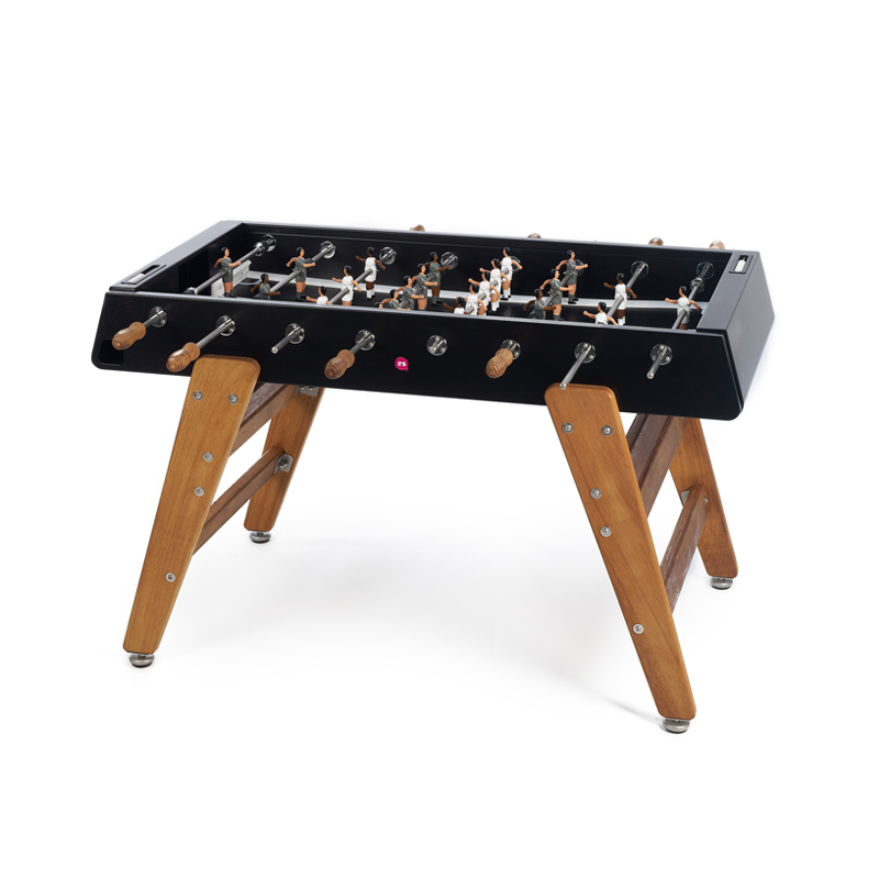 Le baby-foot RS3 Wood représente la progression de RS Barcelona dans sa détermination à repousser les limites. Pour adapter le baby-foot à la vie extérieure, la marque a choisi l’iroko, un bois extrêmement résistant. Les pieds en bois confèrent au design du baby-foot RS3 Wood une chaleur et un look contemporain. Conservant l’essence du jeu, ce baby-foot permet de profiter pleinement d’un match tout en bénéficiant d’un design durable et esthétique. Pour chaque couleur, le RS3 Wood est livré avec des équipes standard. Cependant, sur demande, les équipes peuvent être personnalisées : formation de l’équipe (3-3-4 ou 2-5-3), équipes masculines, féminines, équipes mixtes, couleur de peau, couleur du terrain, couleurs des maillots, ajout de logos...