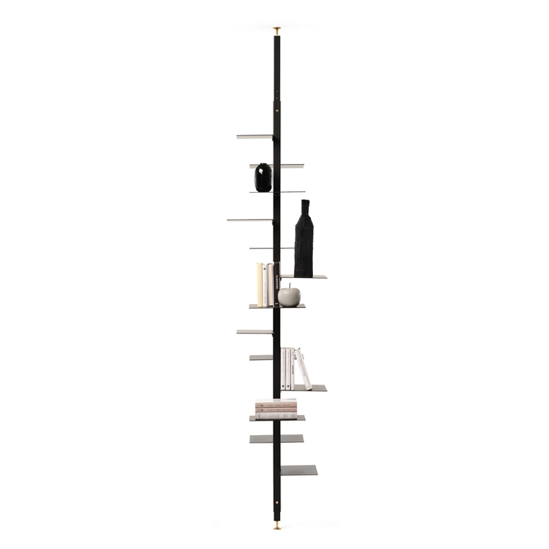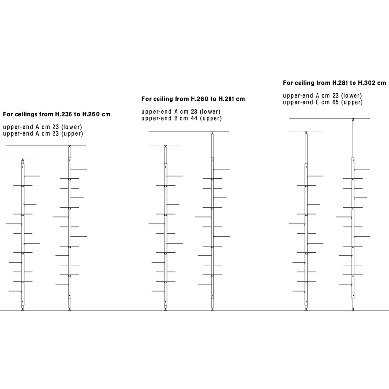 rangement élégant se fixe entre le sol et le plafond grâce à une tige verticale réglable pour s’adapter à la hauteur sous plafond de votre pièce. Sur les quatre côtés de la structure sont fixées 13 étagères de différentes dimensions (20x30 cm et 25x30 cm) qui créent un effet visuel dynamique et graphique. Grâce à son système d’accroche, l’