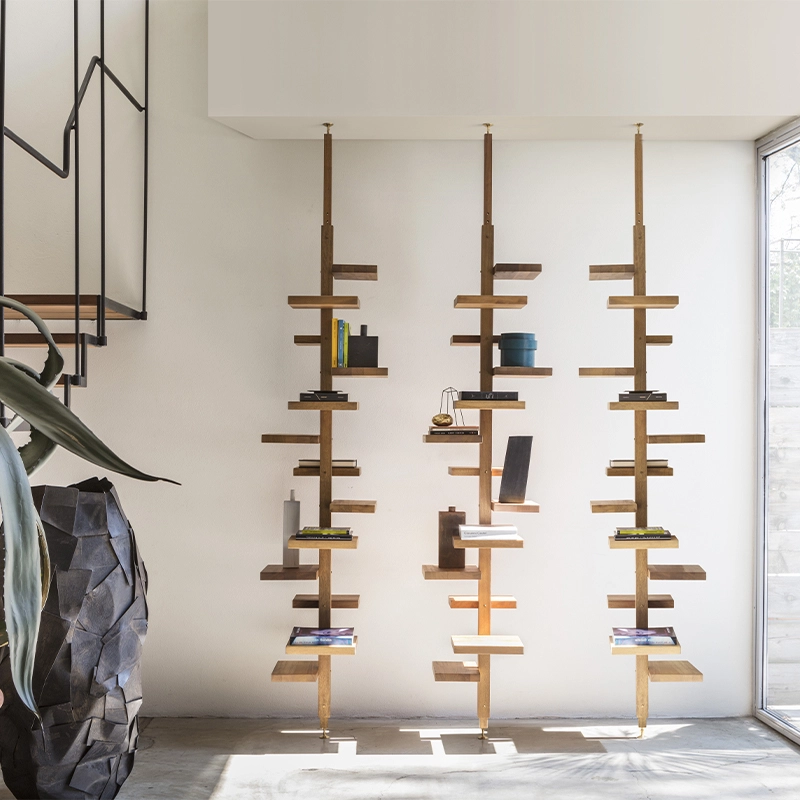 rangement élégant se fixe entre le sol et le plafond grâce à une tige verticale réglable pour s’adapter à la hauteur sous plafond de votre pièce. Sur les quatre côtés de la structure sont fixées 13 étagères de différentes dimensions (20x30 cm et 25x30 cm) qui créent un effet visuel dynamique et graphique. Grâce à son système d’accroche, l’