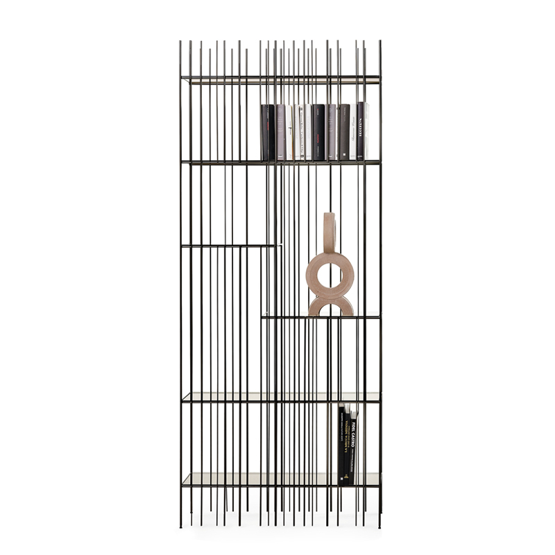 Metrica, le rythme est marqué par les tiges métalliques fixées à différents intervalles sur une structure rigoureuse. Les livres et les objets qui s’y installent viennent compléter la forme et l’allure finale. Grâce à sa composition en tiges de métal et en verre,