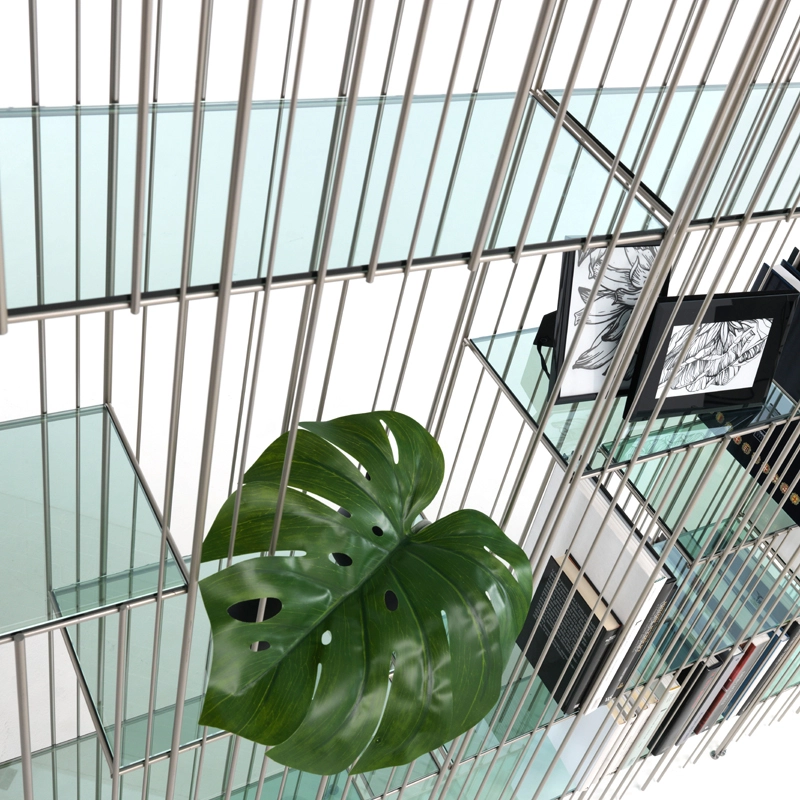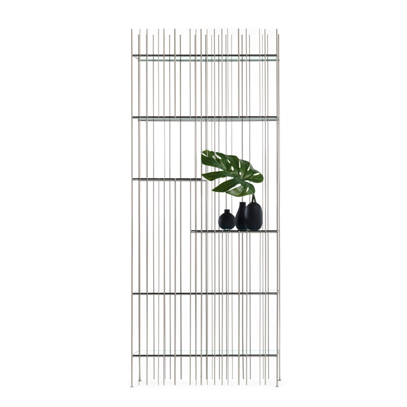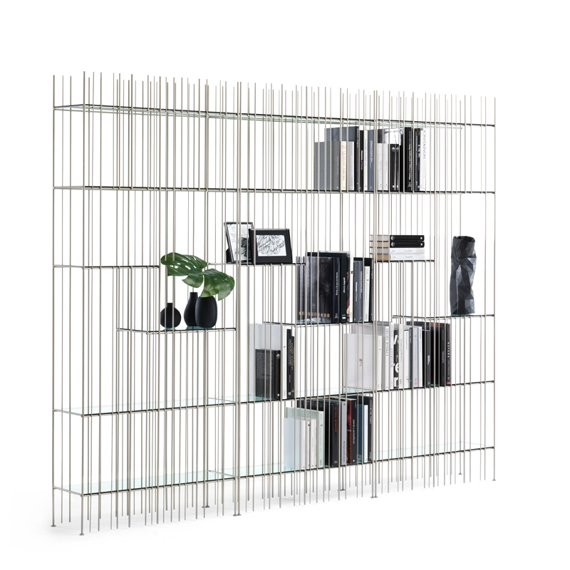 Metrica, le rythme est marqué par les tiges métalliques fixées à différents intervalles sur une structure rigoureuse. Les livres et les objets qui s’y installent viennent compléter la forme et l’allure finale. Grâce à sa composition en tiges de métal et en verre,