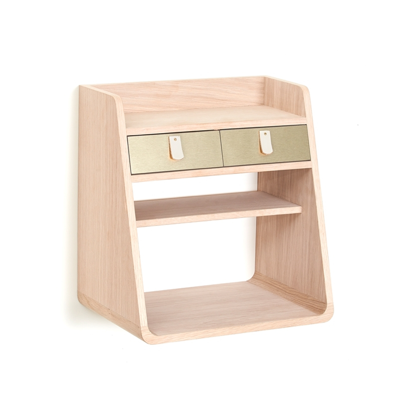 Dessiné par Florence Watine, Suzon est un petit rangement mural élégant et fonctionnel. Il se distingue par ses formes douces et l'association originale des matériaux. La structure en bois est associée à deux petits tiroirs laqués ou plaqués de laiton. Les poignées en cuir ajoutent une touche de raffinement à l'ensemble. Edité par Hartô, Suzon est idéale aussi bien dans l'entrée, en tant que vide-poche, que dans la chambre, pour une utilisation en table de chevet.
