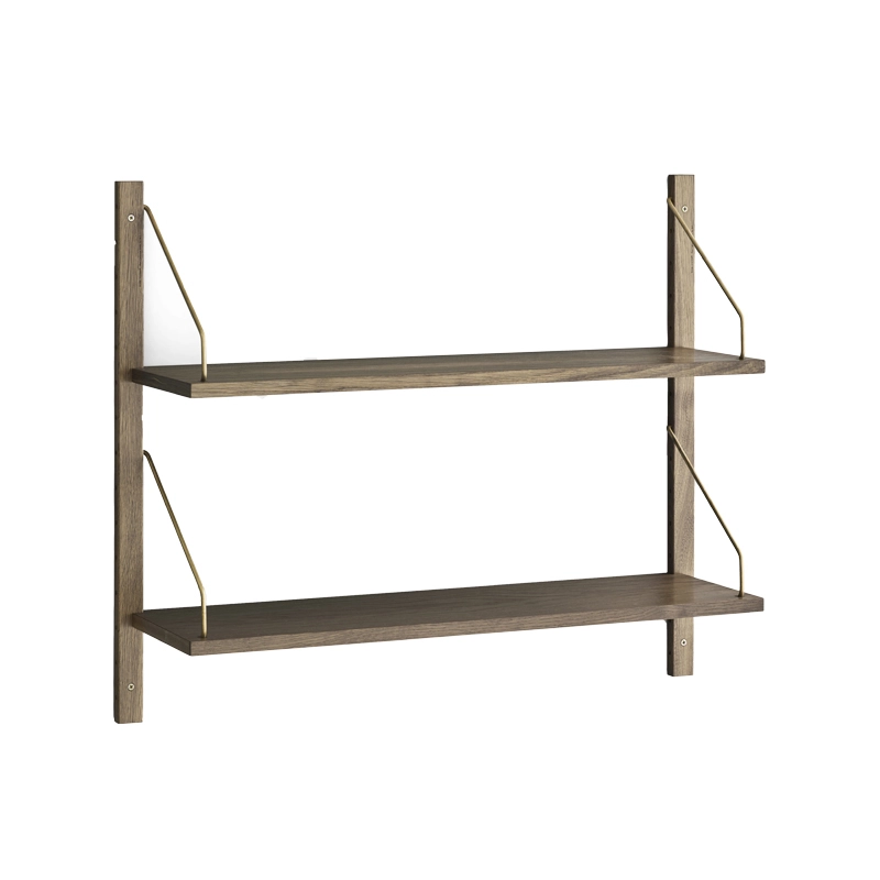 Royal System se compose de rails muraux en bois, d'étagères avec cintres en laiton ou en acier inoxydable et de diverses armoires. Le système peut être personnalisé dans de multiples combinaisons individuelles – soit comme système de bureau moderne, soit comme bibliothèque avec différentes armoires.