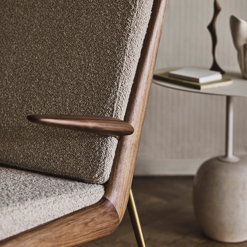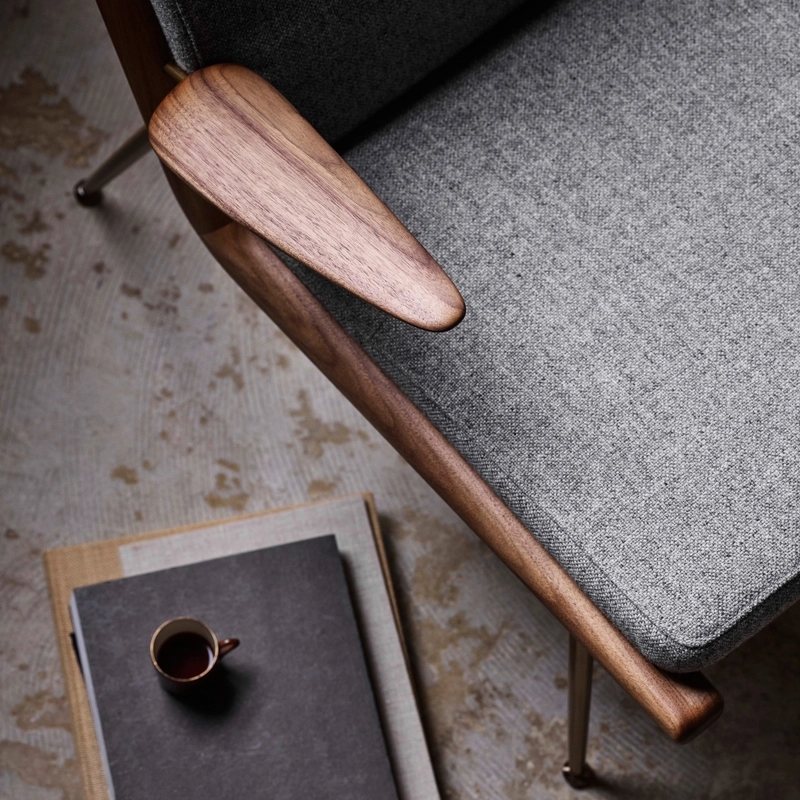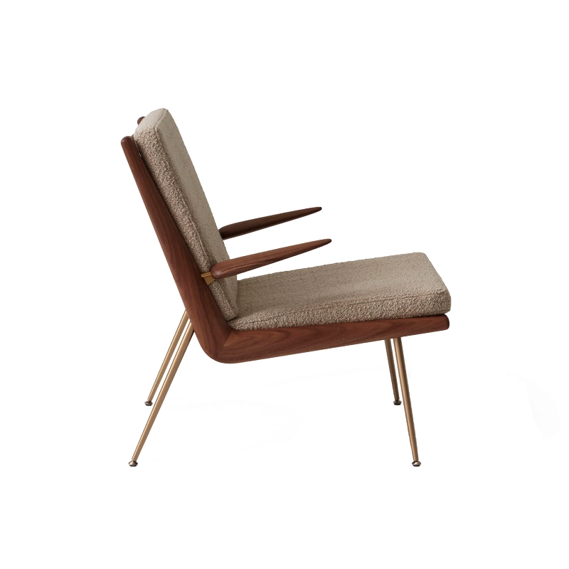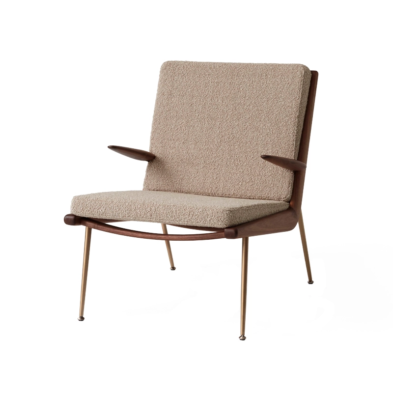Lancé pour la première fois en 1956, le fauteuil Boomerang du duo Hvidt & Mølgaard a une forme épurée et sans artifices. Avec sa structure en bois poli à la main à ses pieds en laiton, le Boomerang reste un chef-d'œuvre du design danois. Edité par And Tradition, le fauteuil Boomerang est disponible avec ou sans accoudoirs, se décline chêne ou en noyer et dans une grande variété de tissus.