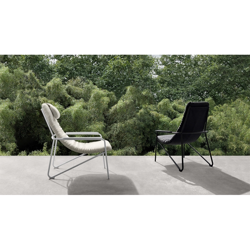 structure acier inoxydable finition époxy, accoudoirs hpl outdoor, assise suspendue mousse et tissu outdoor