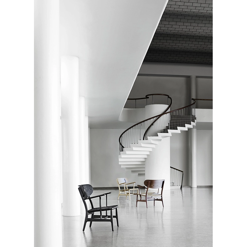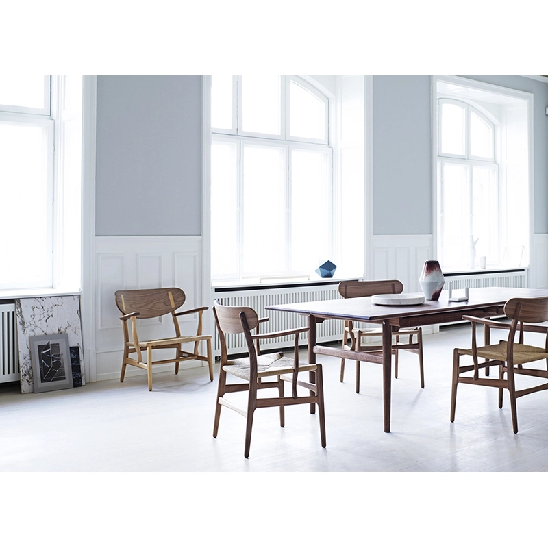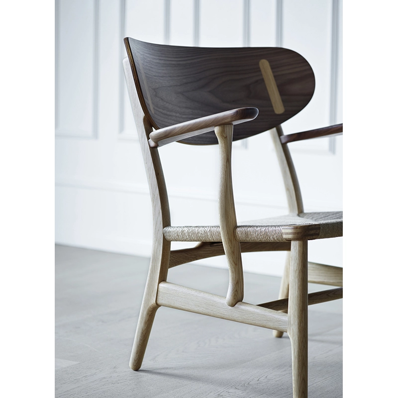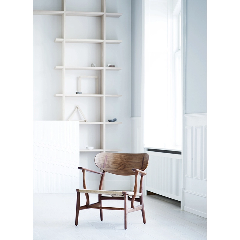 Après avoir été hors production pendant plusieurs décennies, le petit fauteuil CH22 de Hans J. Wegner est réédité par Carl Hansen & Søn depuis 2016. À première vue, on peut remarquer le grand dossier en bois avec des capuchons visibles, si caractéristique, mais sur une inspection plus approfondie du fauteuil, plus de détails distinctifs de Wegner deviennent apparents, comme au niveau des accoudoirs ou sur le tressage du siège. Bien que la production se soit naturellement modernisée, aujourd'hui, le fauteuil CH22 est toujours fabriqué en utilisant les mêmes principes de savoir-faire que lorsque Wegner a suivi et participé à la fabrication des premiers exemples dans l'atelier familial de Carl Hansen en 1950. Entre-temps, la modernisation a amélioré la précision de sorte que les pieds avant, qui étaient ronds à l'origine, peuvent désormais avoir le même profil que les pieds arrière de la chaise. Cela signifie que les pieds du petit fauteuil CH22 sont maintenant fabriqués comme Wegner les avait dessinés à l'origine sur son dessin technique.