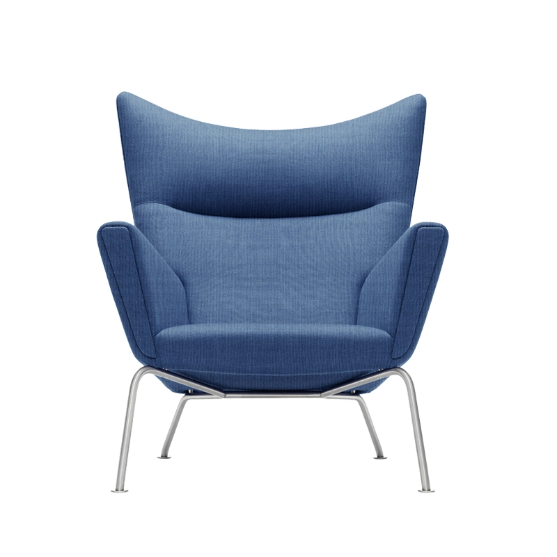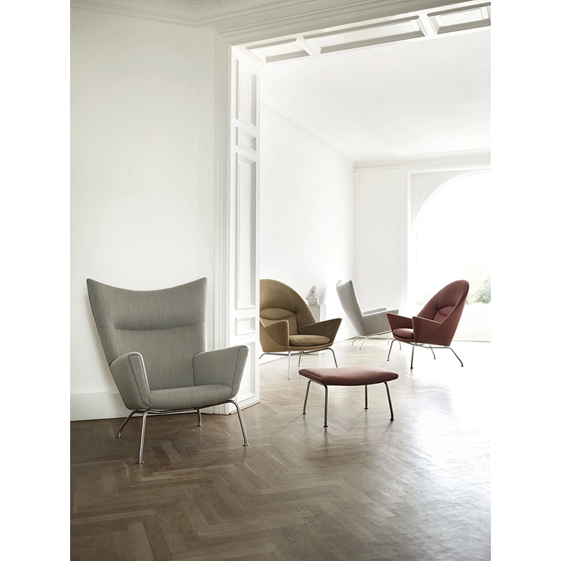 Le fauteuil CH445 de Hans J. Wegner pour Carl Hansen, également connu sous le nom de Wing Chair, est un fauteuil entièrement rembourré qui repose sur une structure en acier inoxydable. Le fauteuil, avec ses lignes distinctives et son confort d'assise agréable, est un bel exemple de ce que doit être un fauteuil à dossier haut selon Wegner. Sous le rembourrage se trouve un cadre en hêtre massif qui confère à au fauteuil résistance et durabilité. La forme précise et la densité du rembourrage sont soigneusement choisies afin que le fauteuil puisse soutenir au mieux toutes les parties du corps. Le siège et le dossier de CH445 sont conçus pour fournir un soutien confortable pour le dos, les épaules, le cou et la tête dans différentes positions assises. La structure fine et arrondie en acier inoxydable présente des pieds avant légèrement inclinés, tandis que les pieds arrière dépassent loin derrières afin que le fauteuil, malgré sa position inclinée, ne bascule pas. Quatre petits éléments en acier en forme de cône relient la partie supérieure du fauteuil au cadre. Le fauteuil Wing Chair CH445 a été conçu en 1960 et seuls quelques exemplaires avaient été produits. Carl Hansen & Søn a relancé la chaise en 2006.