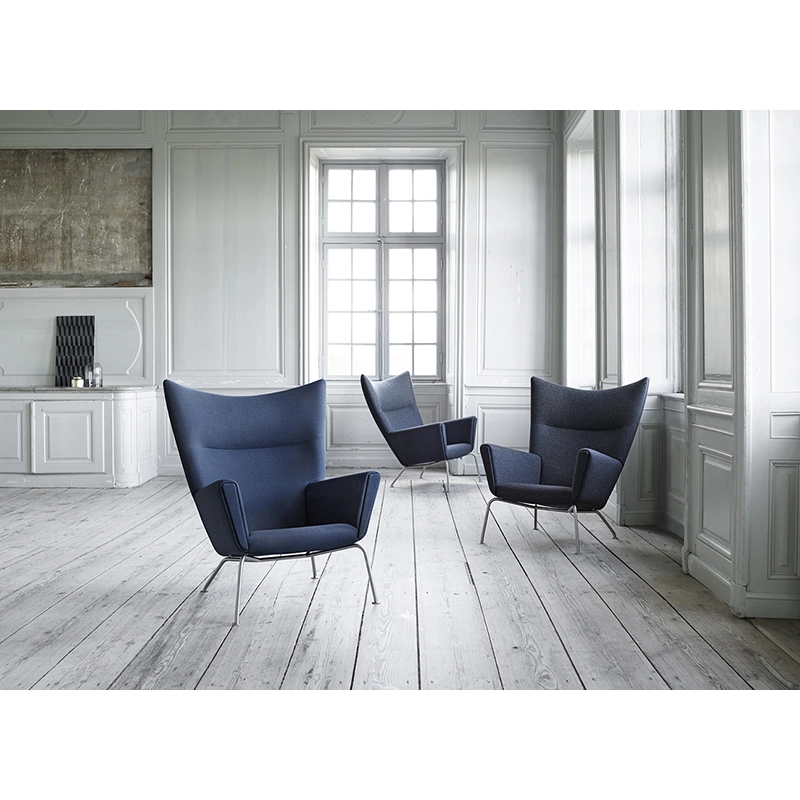 Le fauteuil CH445 de Hans J. Wegner pour Carl Hansen, également connu sous le nom de Wing Chair, est un fauteuil entièrement rembourré qui repose sur une structure en acier inoxydable. Le fauteuil, avec ses lignes distinctives et son confort d'assise agréable, est un bel exemple de ce que doit être un fauteuil à dossier haut selon Wegner. Sous le rembourrage se trouve un cadre en hêtre massif qui confère à au fauteuil résistance et durabilité. La forme précise et la densité du rembourrage sont soigneusement choisies afin que le fauteuil puisse soutenir au mieux toutes les parties du corps. Le siège et le dossier de CH445 sont conçus pour fournir un soutien confortable pour le dos, les épaules, le cou et la tête dans différentes positions assises. La structure fine et arrondie en acier inoxydable présente des pieds avant légèrement inclinés, tandis que les pieds arrière dépassent loin derrières afin que le fauteuil, malgré sa position inclinée, ne bascule pas. Quatre petits éléments en acier en forme de cône relient la partie supérieure du fauteuil au cadre. Le fauteuil Wing Chair CH445 a été conçu en 1960 et seuls quelques exemplaires avaient été produits. Carl Hansen & Søn a relancé la chaise en 2006.