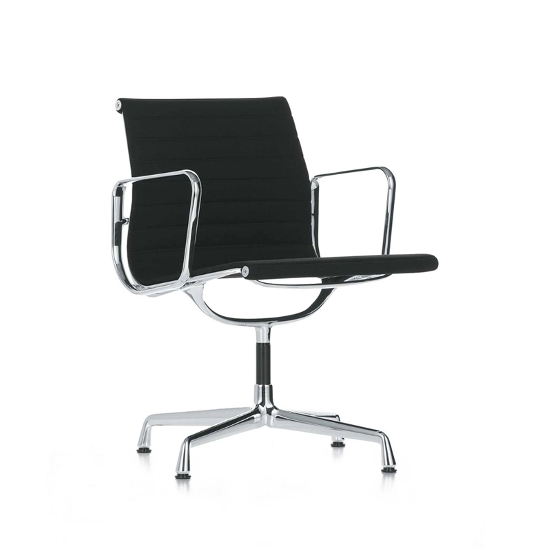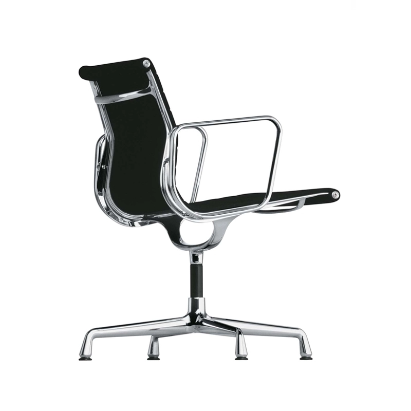 Véritable emblème design en terme de siège de travail, l'Aluminium Chair de Charles & Ray Eames pour Vitra épouse les formes du corps de son utilisateur et assure un confort élevé. Depuis plus de cinquante ans, l'Aluminium Chair est un classique qui apporte élégance moderne à des espaces situés dans le monde entier.  Grâce à un alliage judicieux de métaux, le revêtement en tissu Hopsack noir est astucieusement tendu, et constitue ainsi un véritable élément porteur de la structure. Cette dernière est en aluminium injecté chromé, et pourvue d'un piètement à quatre branches. Le fauteuil Aluminium Chair assure un confort optimal grâce à ses lignes qui épousent les formes du corps et son rembourrage fin et soudé à haute fréquence. Ce fauteuil allie fonction stricte, technique, anatomie humaine et rationalité mécanique. La qualité exceptionnelle de la production de ce fauteuil est aujourd'hui garantie 30 ans par la marque : l'authenticité de ce classique du design parle  ainsi d'elle-même.