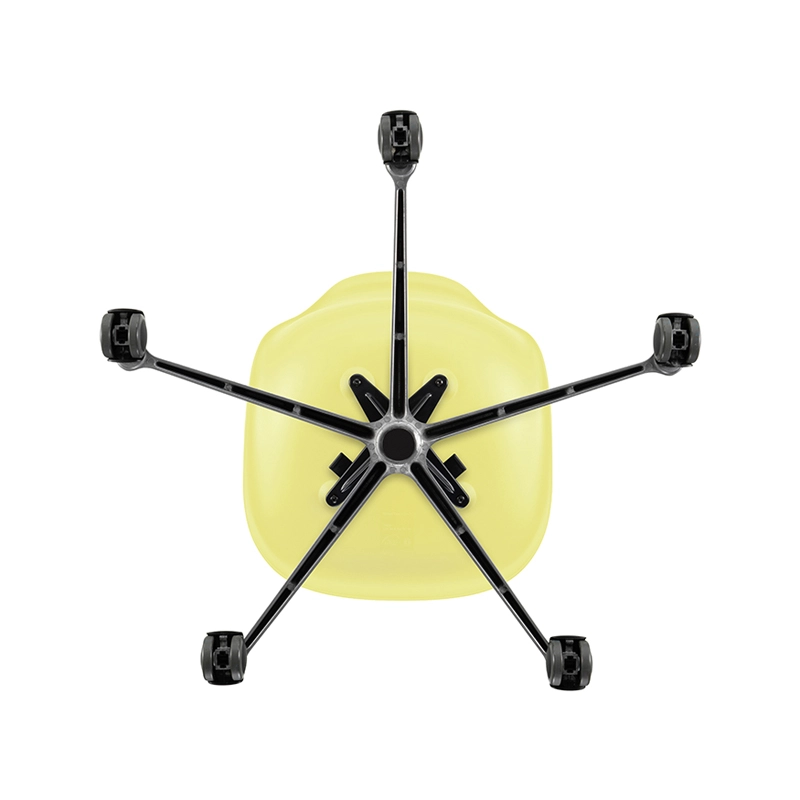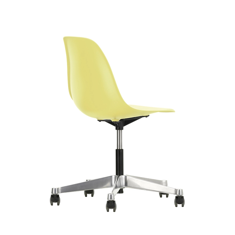 La Eames Plastic Side Chair est la version actualisée de la légendaire Fiberglass Chair de Charles et Ray Eames. Conçue en collaboration avec Zenith Plastics pour le concours « Low Cost Furniture Design » du Museum of Modern Art de New York en 1950, elle fut la première chaise en matière plastique de fabrication industrielle. Editée par Vitra, la Eames Plastic Chair PSCC  (Pivot Sidechair Cast base on Castors) est dotée d'un piétement à roulettes. La coque aux lignes organiques, qui assure un excellent confort, s'associe à ce piètement pivotant et transforme la Side Chair en siège de bureau.