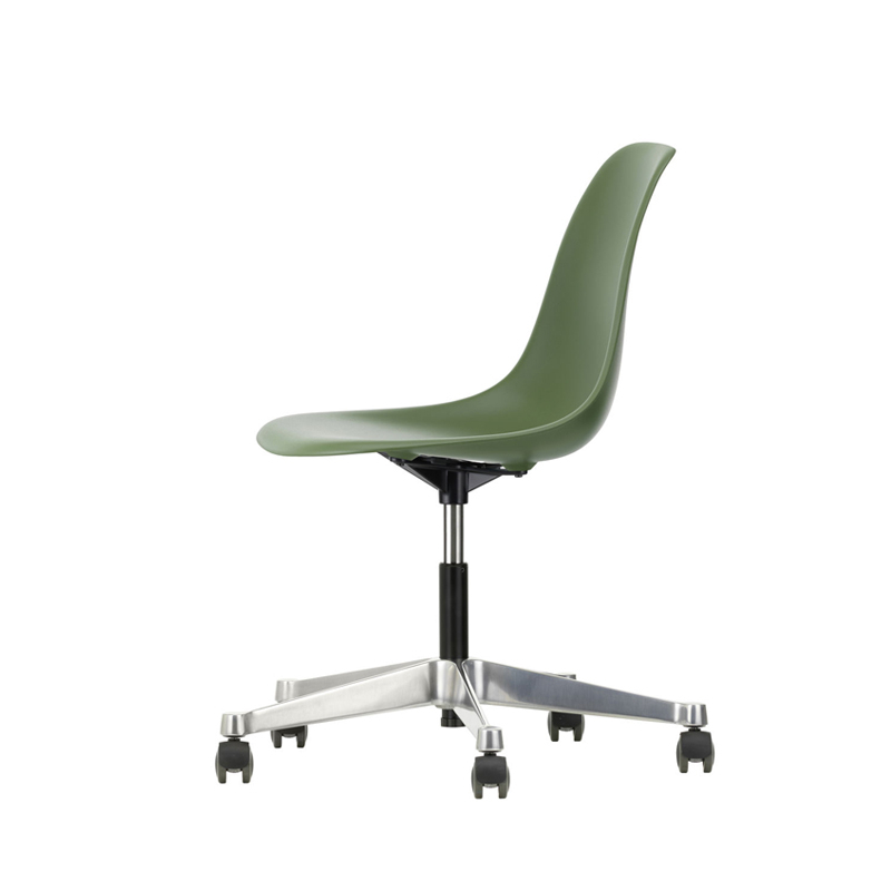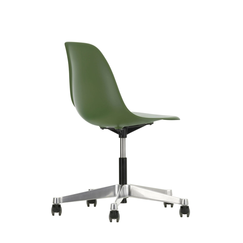 La Eames Plastic Side Chair est la version actualisée de la légendaire Fiberglass Chair de Charles et Ray Eames. Conçue en collaboration avec Zenith Plastics pour le concours « Low Cost Furniture Design » du Museum of Modern Art de New York en 1950, elle fut la première chaise en matière plastique de fabrication industrielle. Editée par Vitra, la Eames Plastic Chair PSCC  (Pivot Sidechair Cast base on Castors) est dotée d'un piétement à roulettes. La coque aux lignes organiques, qui assure un excellent confort, s'associe à ce piètement pivotant et transforme la Side Chair en siège de bureau.