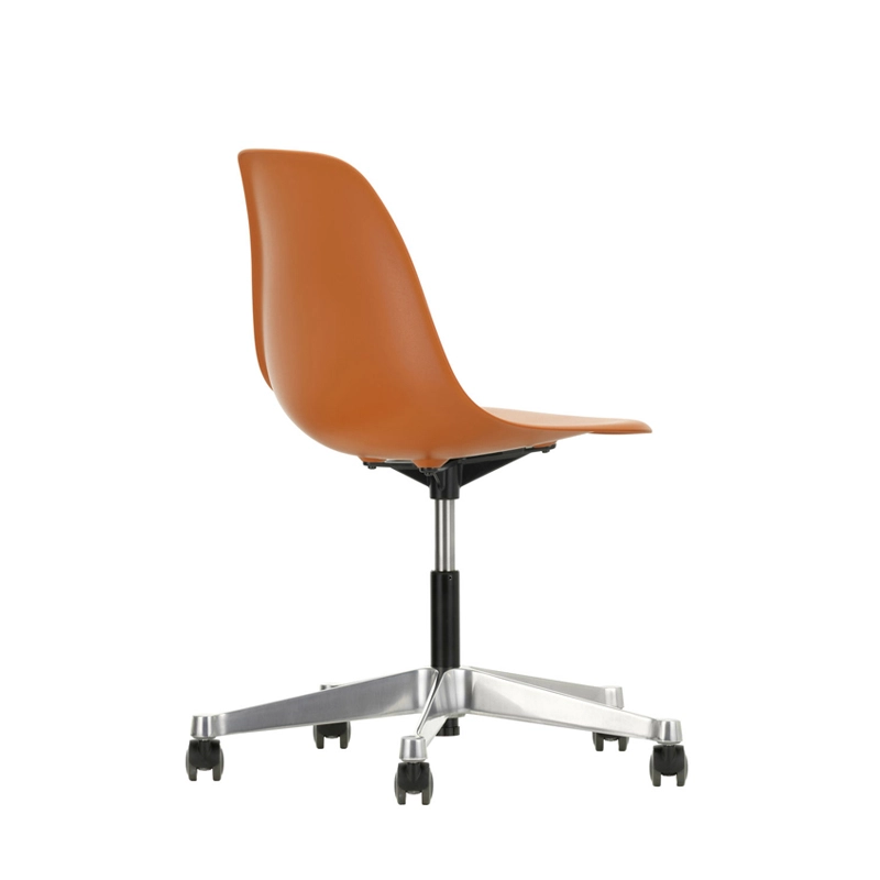 La Eames Plastic Side Chair est la version actualisée de la légendaire Fiberglass Chair de Charles et Ray Eames. Conçue en collaboration avec Zenith Plastics pour le concours « Low Cost Furniture Design » du Museum of Modern Art de New York en 1950, elle fut la première chaise en matière plastique de fabrication industrielle. Editée par Vitra, la Eames Plastic Chair PSCC  (Pivot Sidechair Cast base on Castors) est dotée d'un piétement à roulettes. La coque aux lignes organiques, qui assure un excellent confort, s'associe à ce piètement pivotant et transforme la Side Chair en siège de bureau.