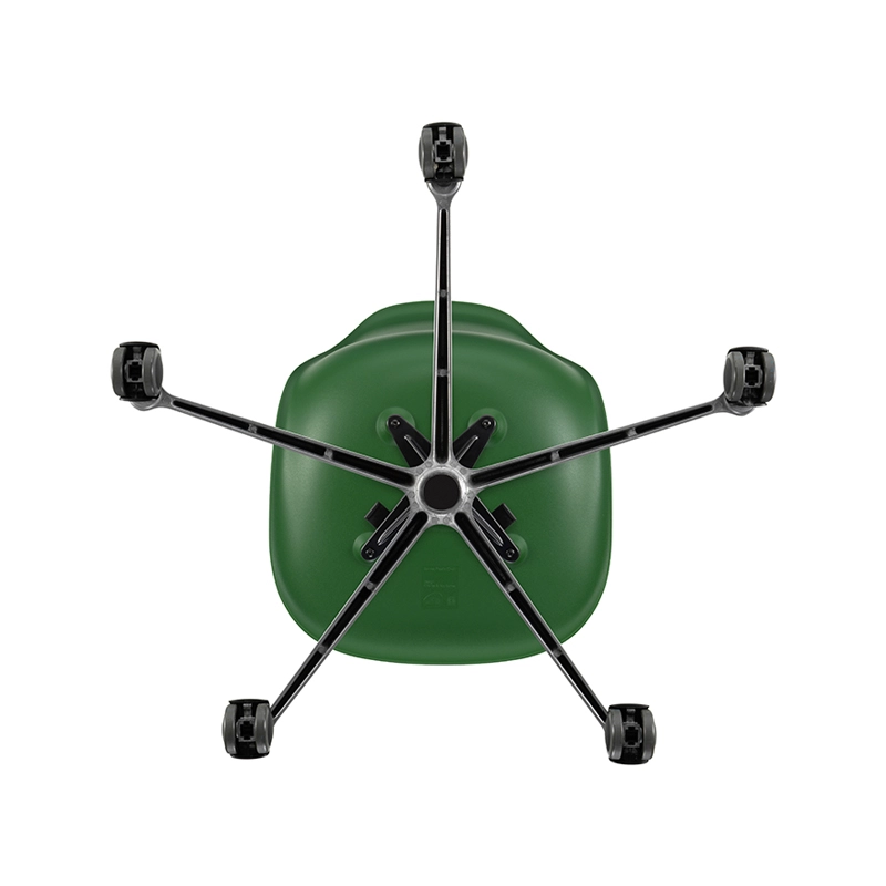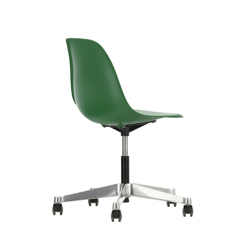 La Eames Plastic Side Chair est la version actualisée de la légendaire Fiberglass Chair de Charles et Ray Eames. Conçue en collaboration avec Zenith Plastics pour le concours « Low Cost Furniture Design » du Museum of Modern Art de New York en 1950, elle fut la première chaise en matière plastique de fabrication industrielle. Editée par Vitra, la Eames Plastic Chair PSCC  (Pivot Sidechair Cast base on Castors) est dotée d'un piétement à roulettes. La coque aux lignes organiques, qui assure un excellent confort, s'associe à ce piètement pivotant et transforme la Side Chair en siège de bureau.