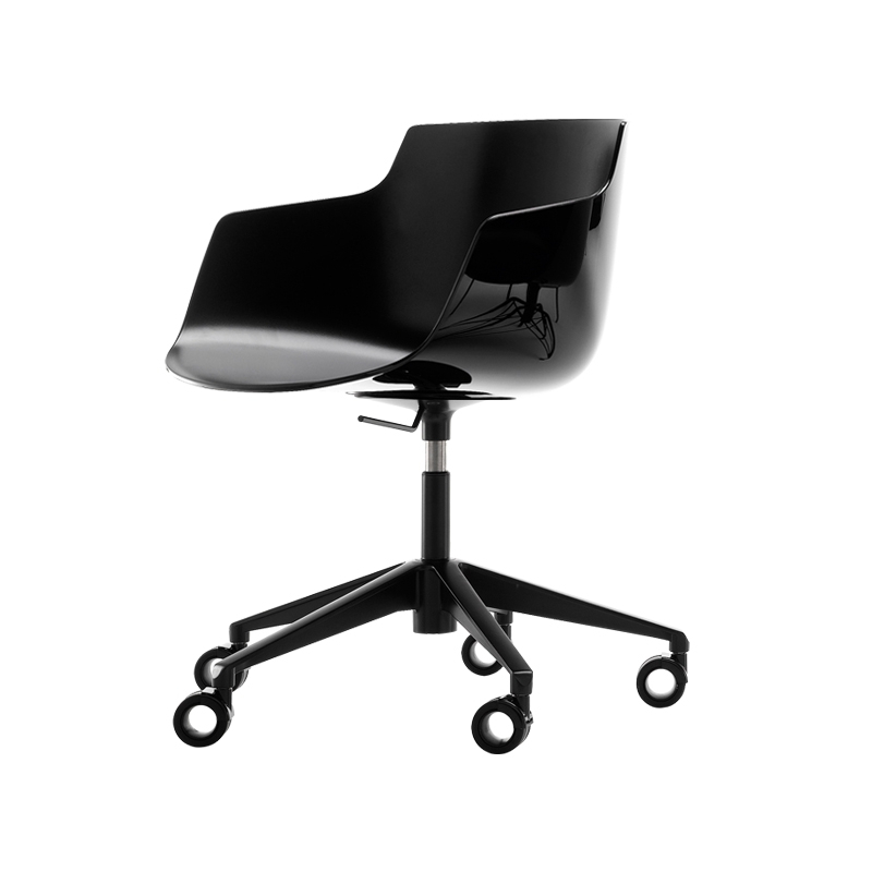 Flow est une famille de chaises confortables, à la silhouette élégante, dessinée par Jean-Marie Massaud pour MDF. Le designer s'est inspiré de classiques du design comme la Plastic Chair de Eames pour développer cette assise en polycarbonate moulé, qui s'associe à différents piétements. La collection Flow s'adapte aussi bien à un usage domestique, dans la cuisine, la salle à manger, que dans des espaces collectifs, comme des bureaux. La coque possède une finition brillante à l'extérieur et gaufrée à l'intérieur. La piètement cinq branches est équipé de roulette et permet de régler la hauteur du siège. Le siège pivote à 360°.