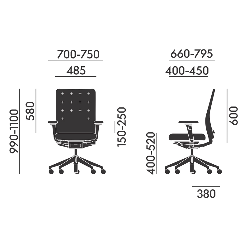 - norme d'ergonomie en 1335 - support lombaire réglable - mécanisme synchrone avec inclinaison vers l'avant et avec réglage individuel de la profondeur d'assise. - accoudoirs 3d réglables en hauteur, largeur, profondeur et pivotant - roulette