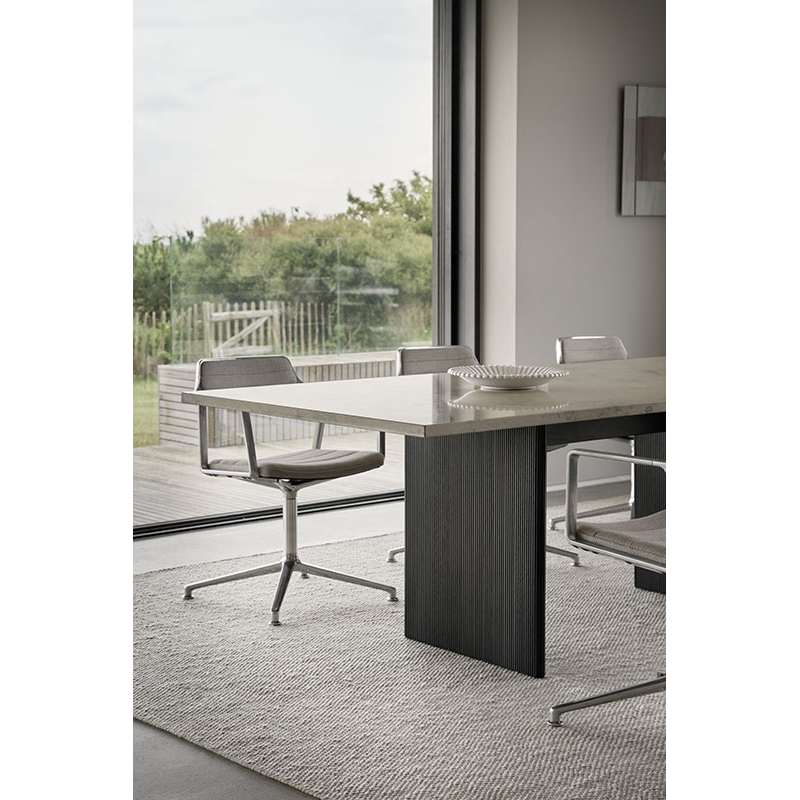 La chaise Swivel 453+ de Vipp allie confort, ergonomie et design raffiné, en faisant un choix idéal pour les espaces de travail et les salles de réunion. Le fauteuil de bureau à patins Swivel offre un siège extra-rembourré, un dossier élargi et une hauteur réglable, garantissant un confort optimal pour des périodes d'assise prolongées. Ses accoudoirs fins s’intègrent harmonieusement au dossier discret et capitonné, conférant au fauteuil une apparence légère malgré sa construction robuste. Monté sur une base à cinq pieds en aluminium poli ou thermolaqué, le fauteuil de bureau Swivel Chair est équipé de roulettes ou de patins au choix, offrant une rotation à 360°. La chaise est disponible en cuir aniline ou en textile haut de gamme, sélectionné par Vipp pour sa qualité et son élégance. Les tissus se composent de 55 % de lin, 35 % de laine et 10 % de polyamide, tandis que le cuir aniline, traité sans chrome, conserve des marques naturelles qui renforcent son caractère unique. Pour garantir une posture saine et un confort supplémentaire, le Swivel+ est doté d’un mécanisme d'inclinaison qui s'adapte automatiquement aux mouvements de l’utilisateur. Chaque détail a été pensé pour assurer une expérience fonctionnelle et durable. Edité par Vipp, ce fauteuilde bureauà patins au design intemporel s’adapte à vos préférences grâce à des options de revêtement sur mesure, disponibles sur demande, pour s’intégrer parfaitement à votre espace de travail.