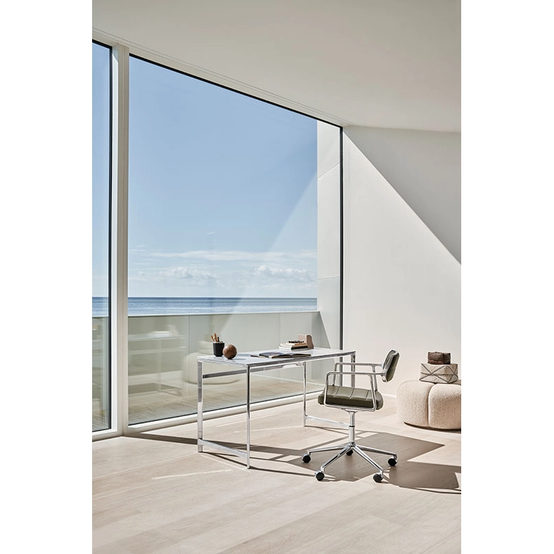 La chaise Swivel 453+ de Vipp allie confort, ergonomie et design raffiné, en faisant un choix idéal pour les espaces de travail et les salles de réunion. Évolution du modèle Swivel original, ce fauteuil de bureau à roulettes offre un siège extra-rembourré, un dossier élargi et une hauteur réglable, garantissant un confort optimal pour des périodes d'assise prolongées. Ses accoudoirs fins s’intègrent harmonieusement au dossier discret et capitonné, conférant au fauteuil une apparence légère malgré sa construction robuste. Monté sur une base à cinq pieds en aluminium poli ou thermolaqué, le fauteuil de bureau Swivel Chair est équipé de roulettes ou de patins au choix, offrant une rotation à 360°. La chaise est disponible en cuir aniline ou en textile haut de gamme, sélectionné par Vipp pour sa qualité et son élégance. Les tissus se composent de 55 % de lin, 35 % de laine et 10 % de polyamide, tandis que le cuir aniline, traité sans chrome, conserve des marques naturelles qui renforcent son caractère unique. Pour garantir une posture saine et un confort supplémentaire, le Swivel+ est doté d’un mécanisme d'inclinaison qui s'adapte automatiquement aux mouvements de l’utilisateur. Chaque détail a été pensé pour assurer une expérience fonctionnelle et durable. Edité par Vipp, ce fauteuilde bureau au design intemporel s’adapte à vos préférences grâce à des options de revêtement sur mesure, disponibles sur demande, pour s’intégrer parfaitement à votre espace de travail.
