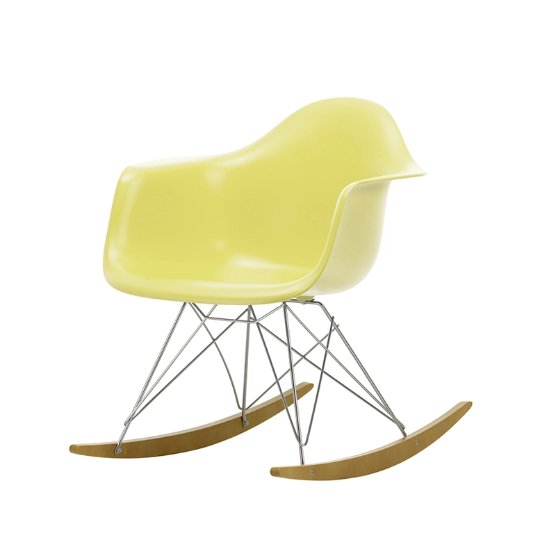 Les Plastic Armchairs ont été présentés pour la première fois par Charles et Ray Eames dans le cadre du concours   « Low Cost Furniture Design » organisé par le Museum of Modern Art de New York. Ces petits fauteuils à bascule furent édités pour la première fois en 1950. La coque aux lignes organiques, en matière synthétique, très confortable, a été combinée par la suite à plusieurs piètements différents. Sur ce modèle de fauteuil RAR à bascule, elle est associée à quatre pieds en croisillons de fil d'acier fixés sur deux patins de bois. Dans leur version actuelle en polypropylène, les Eames Plastic Armchairs RAR (Rocking Armchair Rod base) offrent un confort encore amélioré. Edités par Vitra, ces fauteuils accueillants et confortables sont déclinés dans plusieurs couleurs et trouveront une place dans de nombreuses pièces de votre maison.