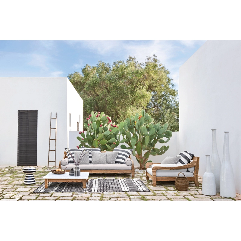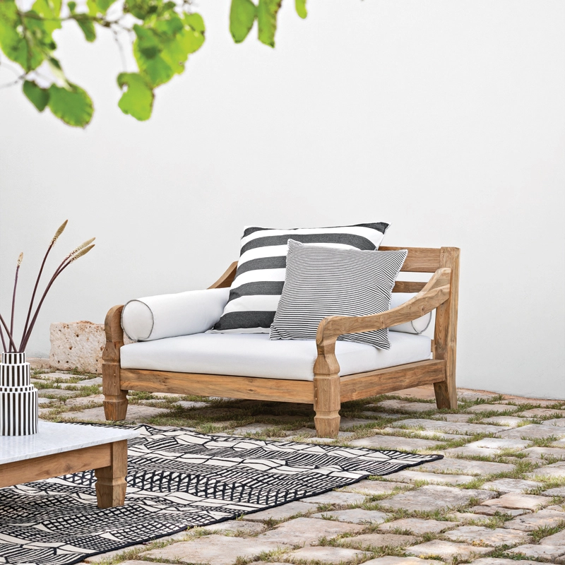 Le fauteuil Jeko 01 créé par Paola Navone pour la marque Gervasoni. De style colonial et d’inspiration exotique, le fauteuil Jeko 01 possède une structure en éco-teck. Conçu pour résister à l’eau et au soleil, ce matériau provient de la valorisation de poutres et d’éléments de récupération en teck, qui sont réparés avec du bois recyclé, assemblés puis polis afin de mettre en valeur les veines d’origine du bois. Le fauteuil Jeko 01 se distingue par son assise large et basse, avec des coussins d'assise et de dossier déhoussables, conçus pour l'extérieur.