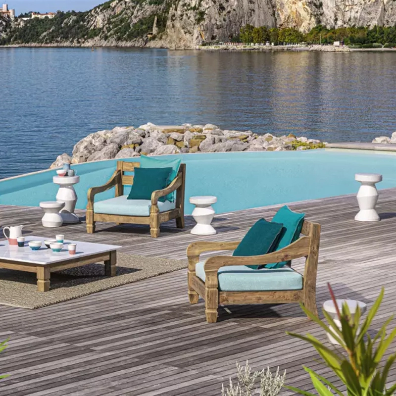 Le fauteuil Jeko 05 est conçu par Paola Navone pour la marque Gervasoni. De style colonial et d’inspiration exotique, le fauteuil Jeko 05 possède une structure en éco-teck. Conçu pour résister à l’eau et au soleil, ce matériau provient de la valorisation de poutres et d’éléments de récupération en teck, qui sont réparés avec du bois recyclé, assemblés puis polis afin de mettre en valeur les veines d’origine du bois. Jeko 05 dispose d’une assise large et basse, avec des coussins d'assise et de dossier déhoussables, conçus pour l'extérieur.
