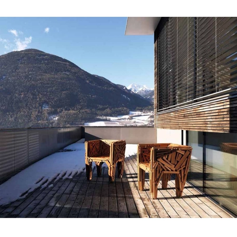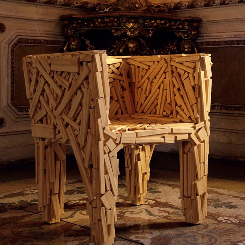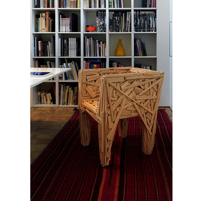 Création des frères Campana, Favela est un fauteuil sans aucune structure, entièrement réalisé à la main avec une multitude de pièces de bois naturel, similaire à celui utilisé au Brésil pour construire les habitations dans les Favelas. Les pièces sont clouées et collées habilement de façon aléatoire manuellement, ce qui rend chaque siège unique. Cette pièce sculpturale est également disponible en version teck pour un usage à l’extérieur. La beauté de Favela, édité par Edra, réside dans ses matériaux naturels, unie à la simplicité apparente de la construction.