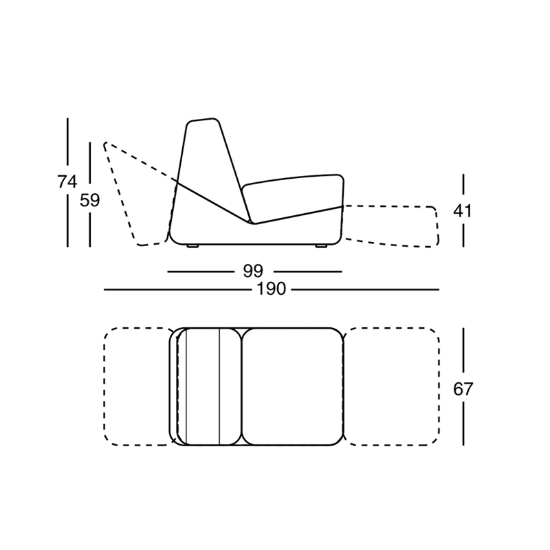 l 67 x p 99 x h 74 cm, assise h 41 cm (plié), l 67 x p 190 x h 59 cm (déplié)
