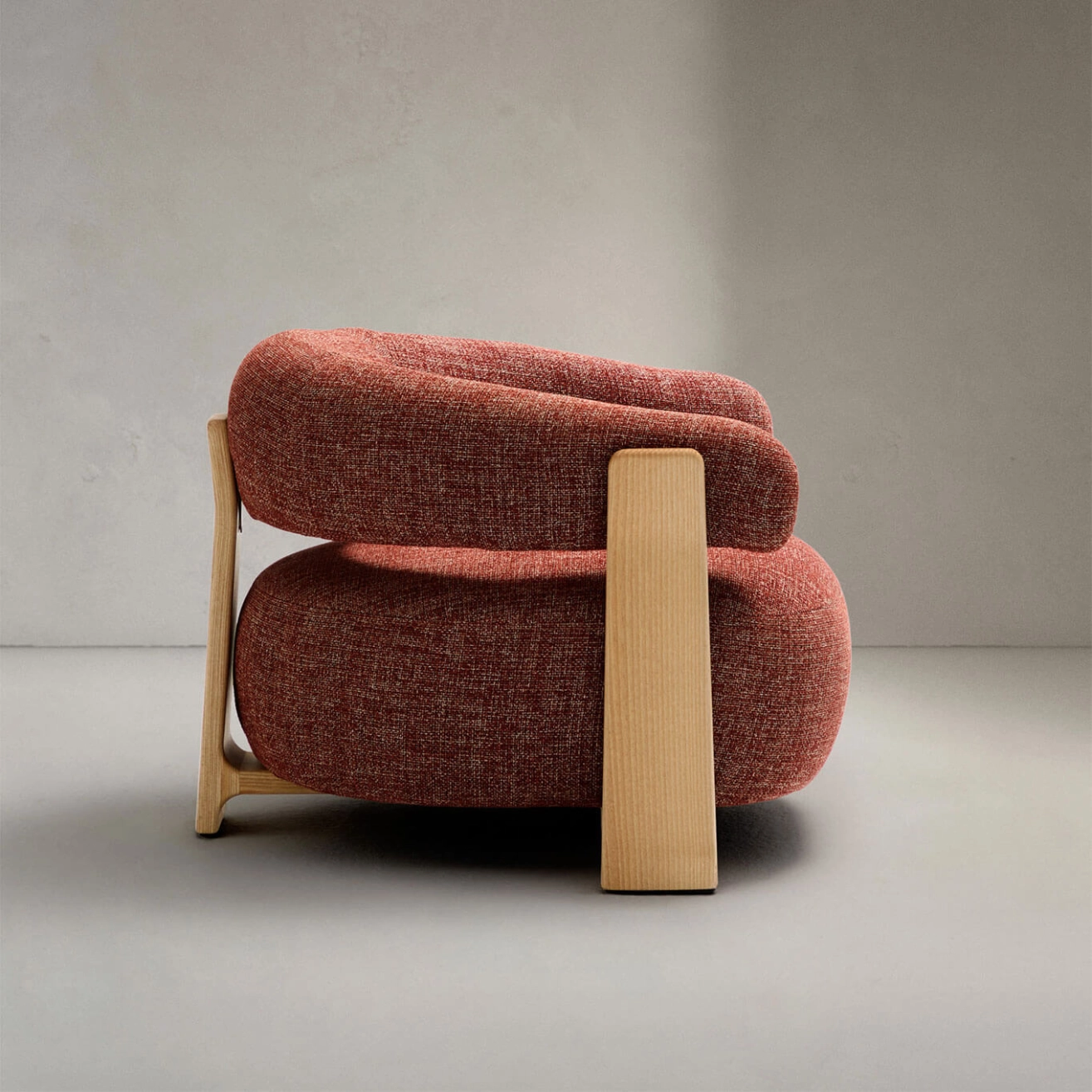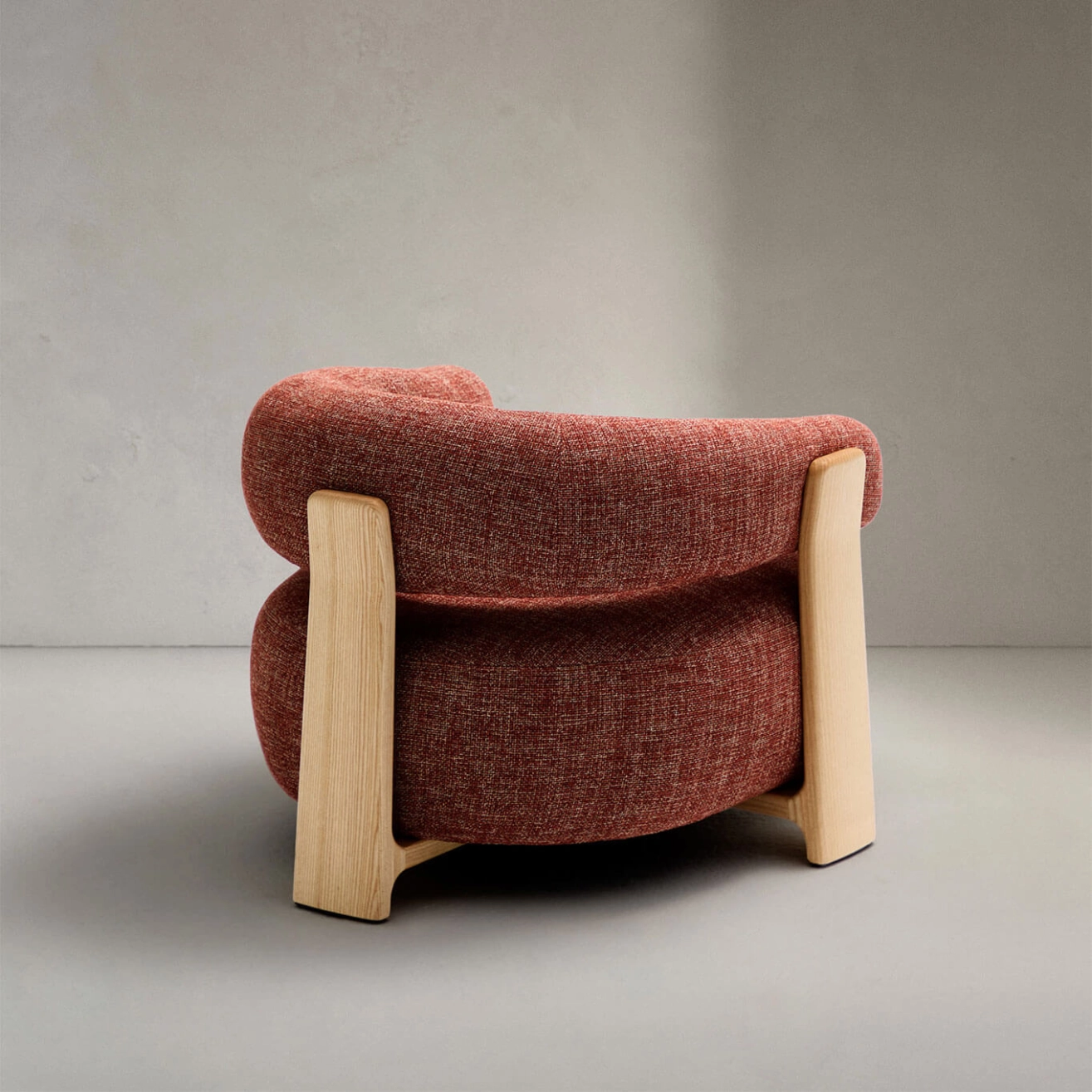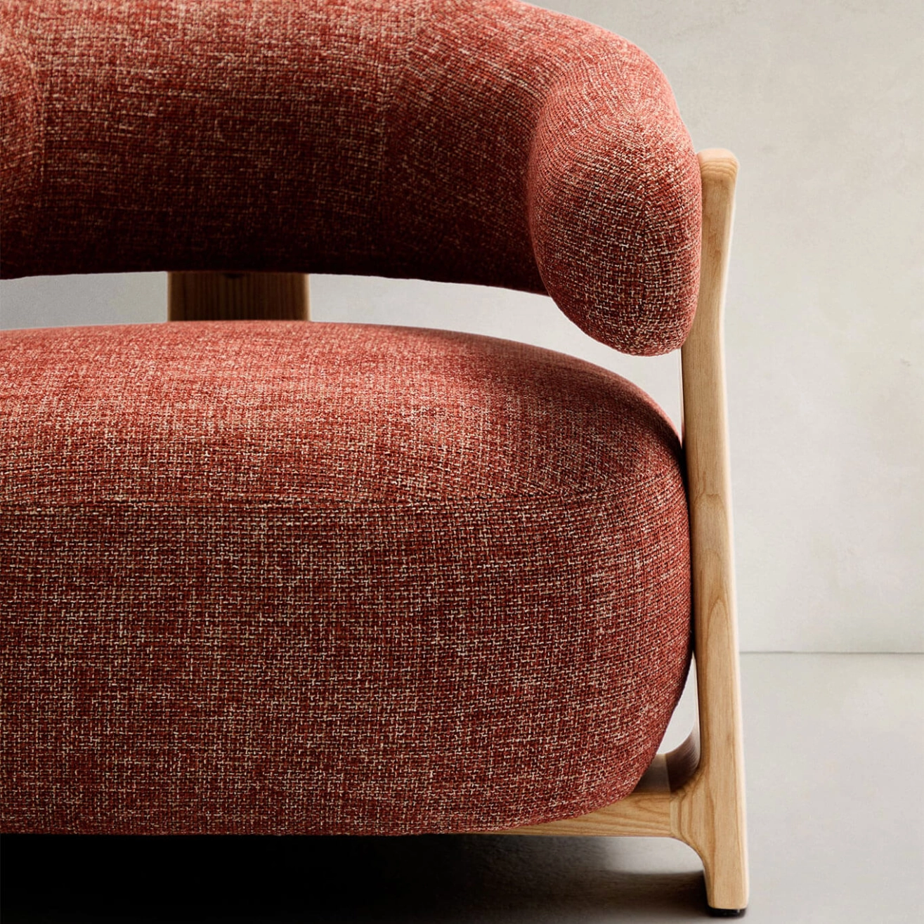 élégance intemporelle, inspirée du style scandinave des années 70, caractérisée par des formes généreuses, enveloppantes et stylisées. Son assise large et son dossier incurvé sont habillés d’un tissu chenille épais, au toucher doux et chaleureux, décliné dans une teinte subtilement nuancée. Ce tissu est composé de