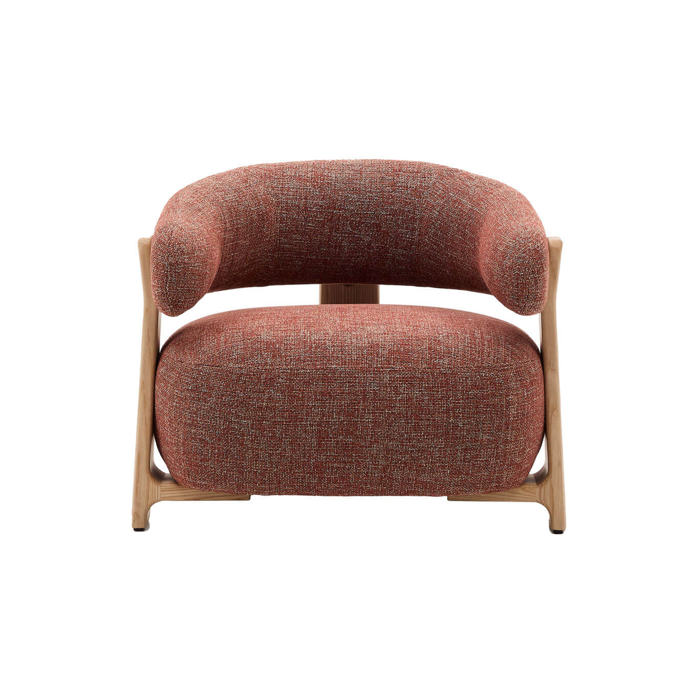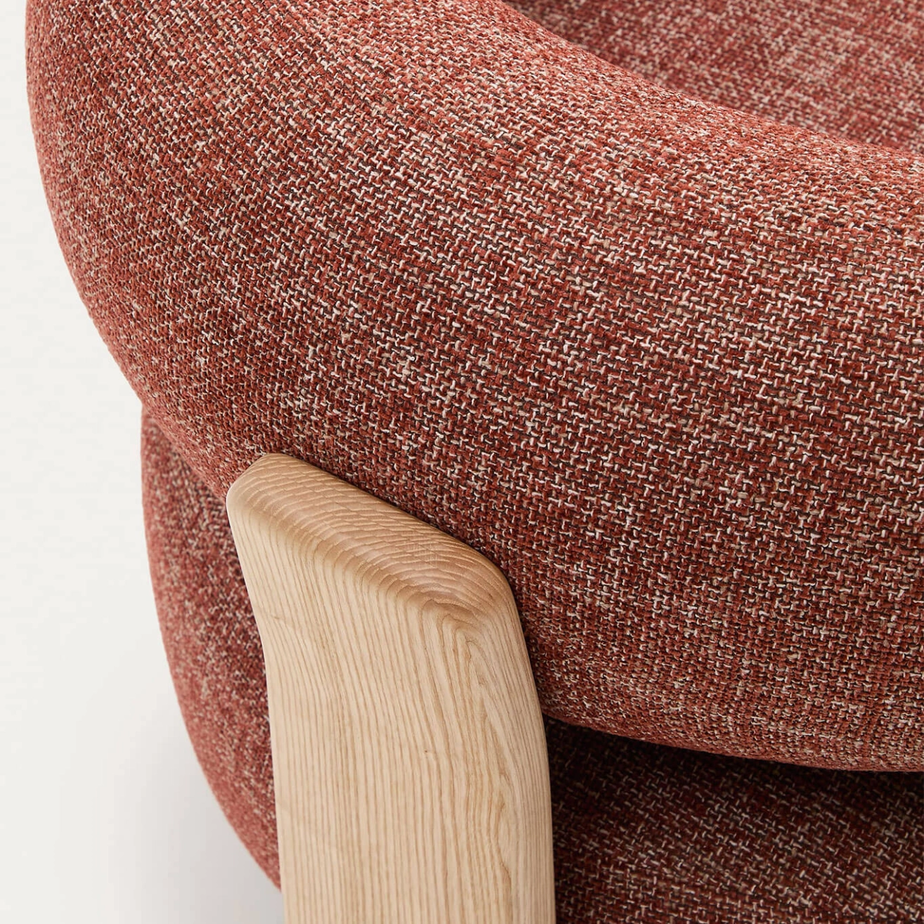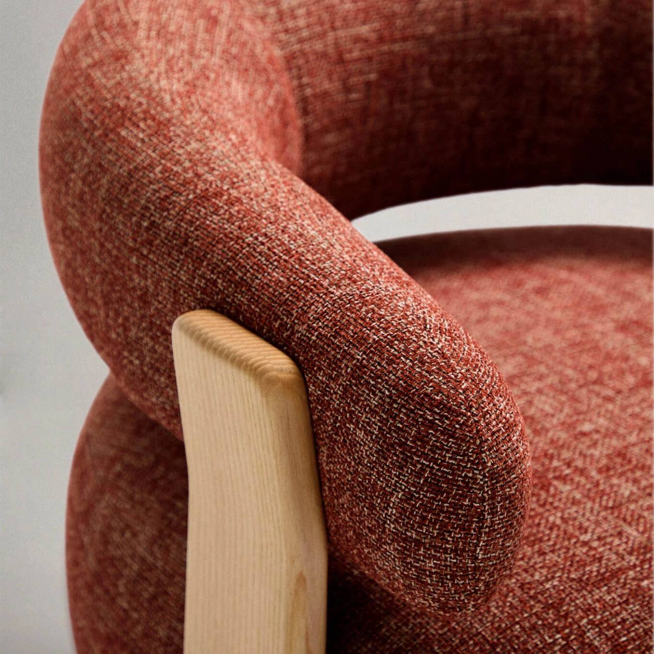 élégance intemporelle, inspirée du style scandinave des années 70, caractérisée par des formes généreuses, enveloppantes et stylisées. Son assise large et son dossier incurvé sont habillés d’un tissu chenille épais, au toucher doux et chaleureux, décliné dans une teinte subtilement nuancée. Ce tissu est composé de