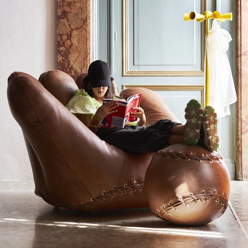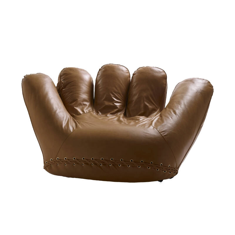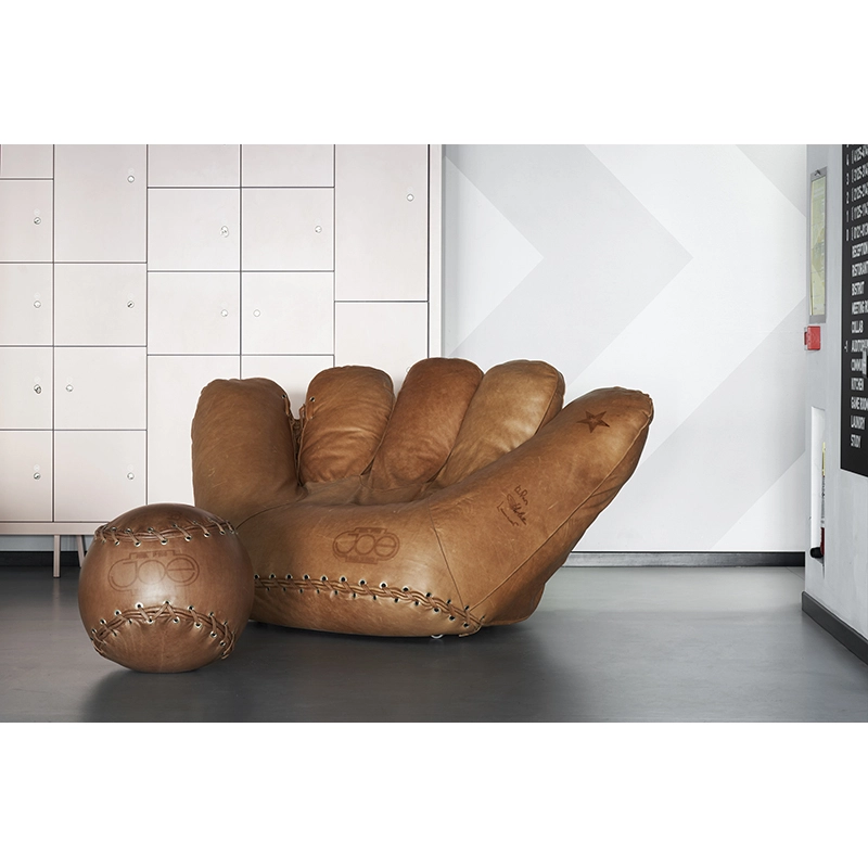 Le fauteuil Joe adopte la forme d’un gant de baseball en cuir géant monté sur des roues invisibles. Inspirés par le Pop Art, les designers De Pas, D’Urbino et Lomazzi offrent avec le fauteuil Joe une forme matérielle à leur admiration pour la légende américaine du baseball Joe DiMaggio. Au-delà de sa forme très originale, Joe est un fauteuil confortable et accueillant dont le revêtement en cuir incarne le travail exceptionnel de la maroquinerie italienne. Conçu dans les années 1970 en collaboration avec la maison Poltronova, Joe a nécessité un travail manuel très précis pour reproduire fidèlement le gant de baseball en cuir classique à une grande échelle, ainsi chaque fauteuil Joe est unique. Ce fauteuil géant a vu le jour grâce aux innovations techniques innovantes de l’époque du polyuréthane expansé préformé, permettant de mouler des objets dans n’importe quelle forme. Le fauteuil Joe, édité par Poltronova, a su se trouver une place au sein des collections permanentes d’instituions prestigieuses telles que le MoMa à New York, le Musée Triennale du Design à Milan et le Musée ADAM à Bruxelles. Joe a également été présenté dans de nombreuses expositions temporaires à travers le monde.