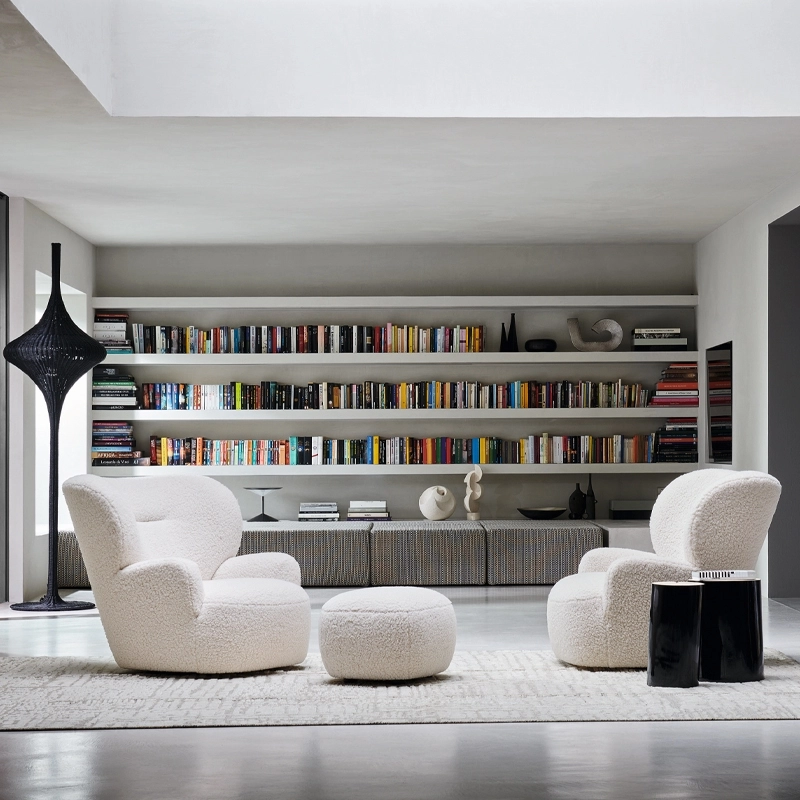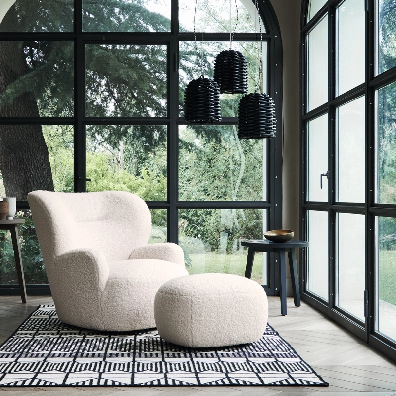 Edité par Gervasoni, Loll 09 est un fauteuil qui se distingue sa forme enveloppante dont la particularité réside dans les proportions entre l’assise et le dossier : ce dernier forme un nid pour l’assise rembourrée de mousse polyuréthane haute densité. Le fauteuil Loll 09 est composé d’une structure en bois massif avec des sangles élastiques à haute teneur en caoutchouc. Le revêtement déhoussable en tissu Bear ajoute une note de confort supplémentaire et un aspect cocooning. Le fauteuil Loll 09 G s’agrémente en plus d’une base pivotante avec mécanisme de retour.